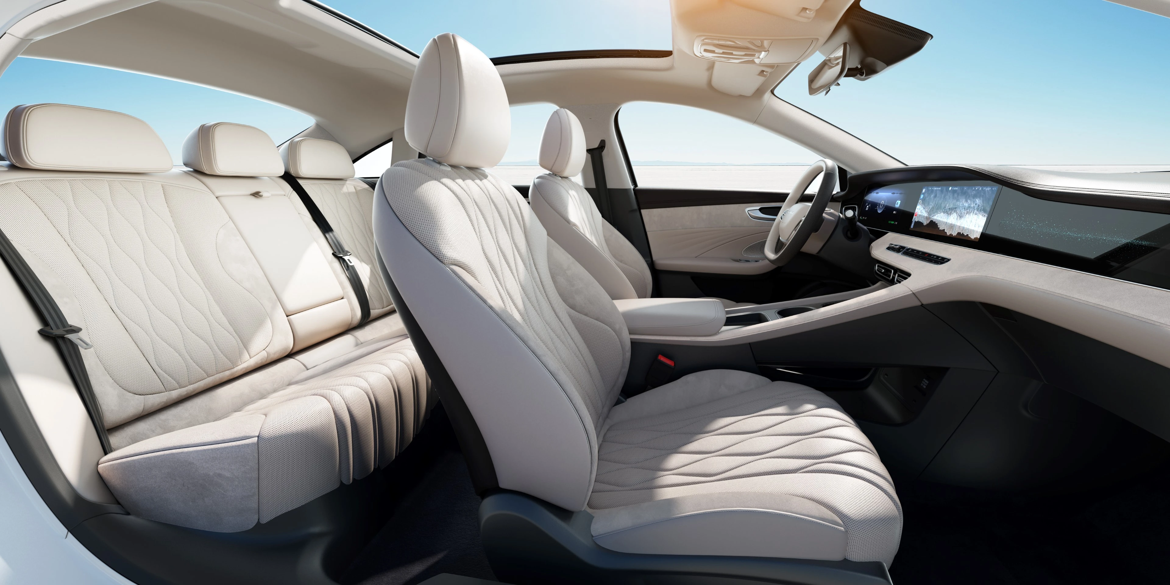ตบแต่งด้วยดีไซน์ที่ล้ำสมัย เรียบหรู ภายในมาพร้อมวัสดุระดับพรีเมียม เบาะหนังกลับคุณภาพสูง และดีไซน์ลายตะเข็บแบบมีรูระบายอากาศ เบาะคนขับปรับไฟฟ้าได้ 10 ทิศทาง พร้อมระบบระบายอากาศและหน่วยความจำ พื้นที่โดยสารตอนหลังกว้างขวาง สะดวกสบาย ดูล้ำสมัยด้วยจอกลางขนาด 12.3 นิ้ว Super- Long LCD Screens ที่มาพร้อมระบบอัจฉริยะ BANMA Intelligent Driving System