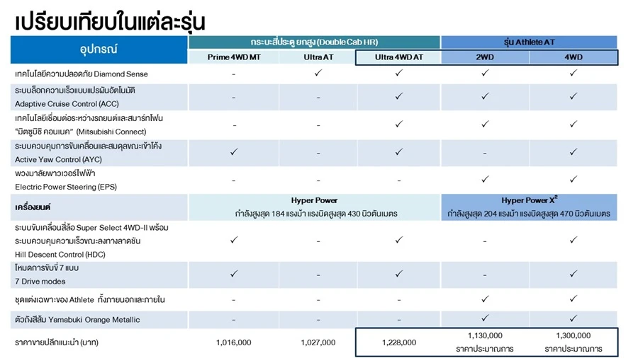 - ออล-นิว ไทรทัน ดับเบิ้ล แค็บ อัลตร้า ขับเคลื่อน 4 ล้อ เกียร์อัตโนมัติ ราคาเริ่มต้น 1,228,000 บาท โดยลูกค้าสามารถรับรถได้ในช่วงปักษ์แรกของเดือนธันวาคม 2566