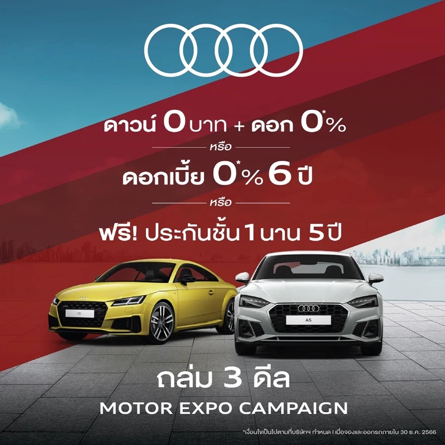 อาวดี้ ลุย Motor Expo ถล่ม 3 ดีล ส่งท้ายปี อัดโปรฯแรง ดาวน์ 0 บาท พร้อมผ่อนดอกเบี้ย 0% หรือเลือกผ่อนดอกเบี้ย 0% สูงสุด 6 ปี หรือฟรีประกันภัยชั้นหนึ่ง 5 ปี พร้อมรับประกันคุณภาพ 5 ปี หรือ 150,000 กิโลเมตร ลูกค้าที่สนใจสามารถเข้าชมรถยนต์ Audi ได้ที่บูธ Audi (B 06) อาคารชาลเลนเจอร์ อิมแพค เมืองทองธานี ระหว่างวันที่ 1-11 ธันวาคมนี้ หรือที่โชว์รูมอาวดี้ทั่วประเทศ