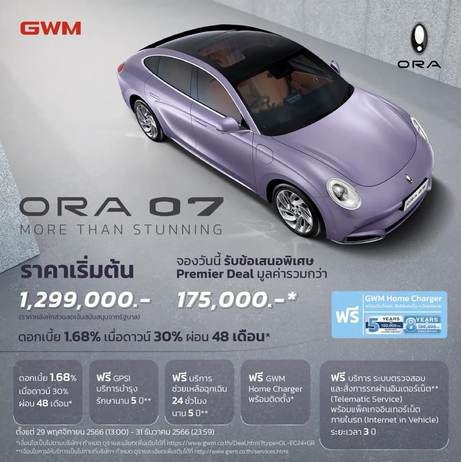 สำหรับผู้ที่สนใจจับจองเป็นเจ้าของ ORA 07 เกรท วอลล์ มอเตอร์ ยังได้จัดเตรียมข้อเสนอสุดพิเศษให้กับแฟน ๆ ชาวไทย อาทิ
