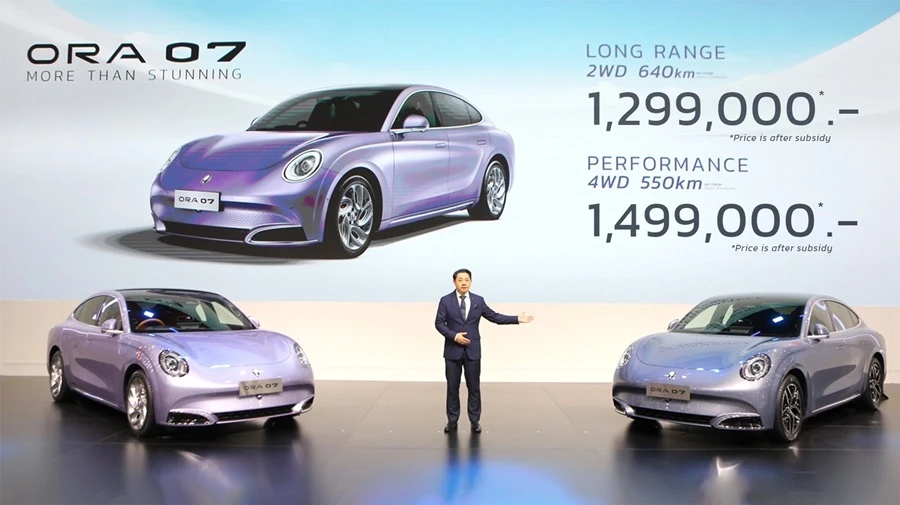 เกรท วอลล์ มอเตอร์ ประกาศความสำเร็จของ Mission 9 in 3 ส่งยานยนต์ไฟฟ้า 100% เรือธงรุ่นล่าสุดสู่ตลาดไทย เปิดตัวและประกาศราคา ORA 07 อย่างเป็นทางการภายในงาน มหกรรมยานยนต์ ครั้งที่ 40 หรือ Motor Expo 2023 เสริมทัพไลน์อัปยานยนต์พลังงานใหม่คุณภาพลำดับที่ 9 สู่ตลาดประเทศไทย โดยราคาอย่างเป็นทางการของ ORA 07 รุ่น LONG RANGE อยู่ที่ 1,299,000 บาท และราคาของ ORA 07 รุ่น PERFORMANCE อยู่ที่ 1,499,000 บาท