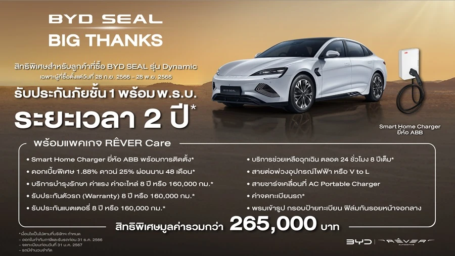 - สำหรับลูกค้าที่ซื้อรถยนต์ไฟฟ้า BYD SEAL Dynamic ตั้งแต่คันแรก ระหว่างวันที่ 28 กันยายน 2566 – 28 พฤศจิกายน 2566 จากฟรีประกันภัยชั้น 1 พร้อม พ.ร.บ. 1 ปี ขยายความคุ้มครองประกันภัยชั้น 1 พร้อม พ.ร.บ. เป็นระยะเวลา 2 ปี