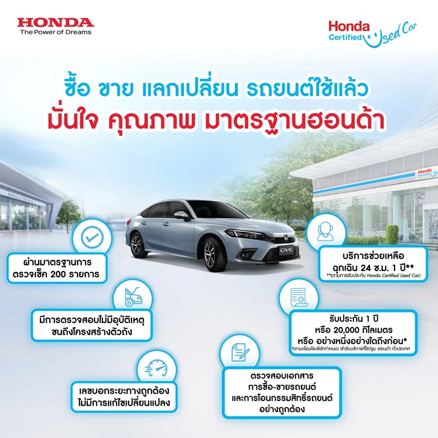 - พิเศษ ด้วยการรับประกัน 1 ปี หรือ 20,000 กิโลเมตร อย่างใดอย่างหนึ่งถึงก่อน (ตามเงื่อนไขที่บริษัทฯ กำหนด) พร้อมด้วยบริการช่วยเหลือฉุกเฉิน 24 ชั่วโมง 1 ปี (ตามการรับประกัน Honda Certified Used Car)