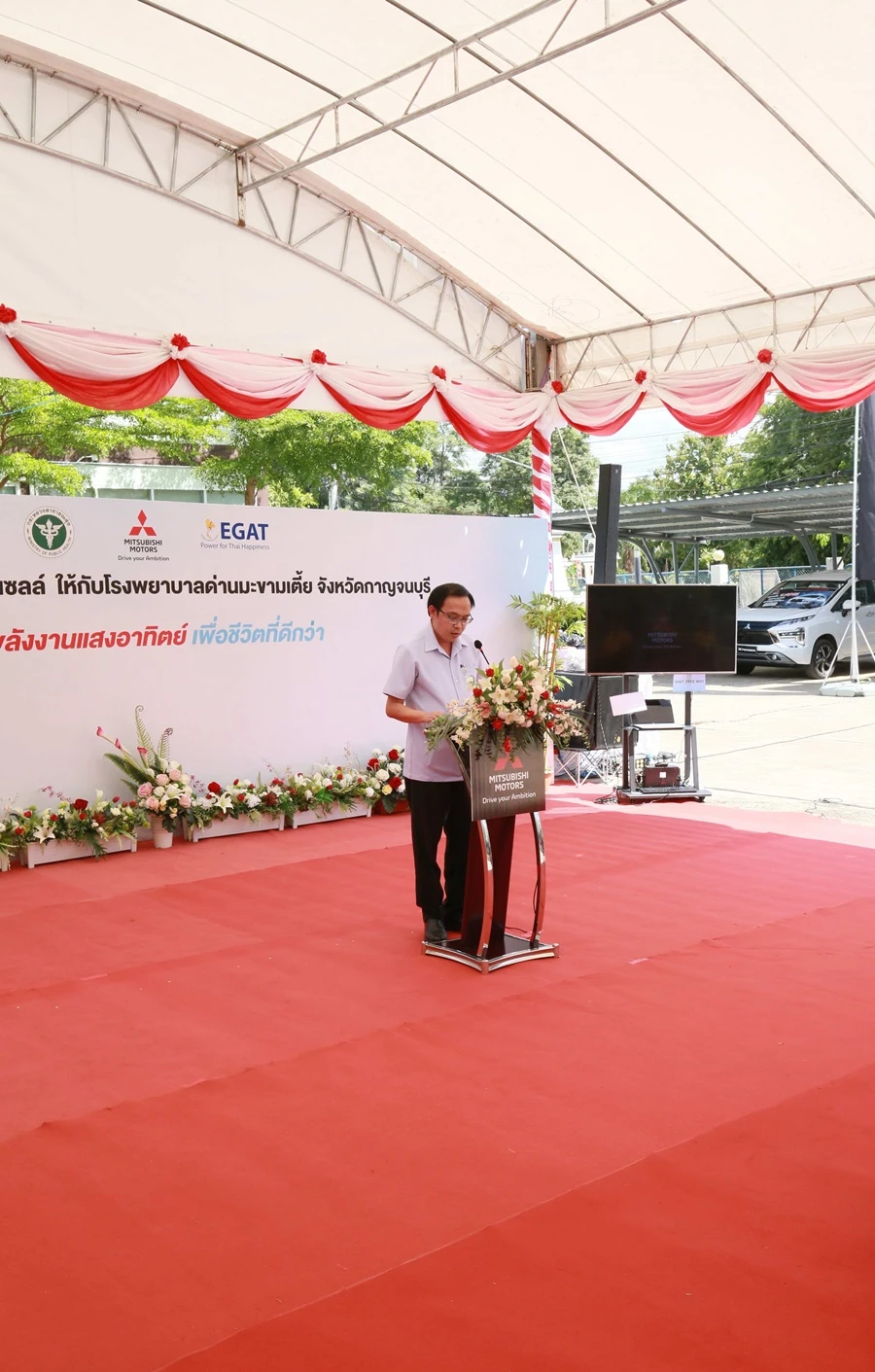 มร. ยาซุโนริ โคะยะนะกิ (ที่ 5 จากซ้าย) ผู้ช่วยกรรมการผู้จัดการใหญ่ ฝ่ายบริการหลังการขาย สิ่งแวดล้อม บริษัท มิตซูบิชิ มอเตอร์ส (ประเทศไทย) จำกัด พร้อมด้วย นายธีรุตม์ บุตรเลิศเจริญ (ที่ 5 จากขวา) ผู้ช่วยกรรมการผู้จัดการใหญ่ ฝ่ายกฎหมายและฝ่ายกลยุทธ์สิ่งแวดล้อม บริษัท มิตซูบิชิ มอเตอร์ส (ประเทศไทย) จำกัด ร่วมส่งมอบระบบไฟฟ้าจากโซล่าร์เซลล์แก่โรงพยาบาลด่านมะขามเตี้ย จังหวัดกาญจนบุรี ซึ่งเป็นโรงพยาบาลทางภาคตะวันตกแห่งแรก และเป็นโรงพยาบาลแห่งที่ 7 ภายใต้โครงการ Solar For Lives : พลังงานแสงอาทิตย์ เพื่อชีวิตที่ดีกว่า จากเป้าหมายที่มุ่งติดตั้งระบบไฟฟ้าจากโซล่าร์เซลล์ขนาด 50 กิโลวัตต์ ให้แก่แต่ละโรงพยาบาลชุมชนทั่วประเทศ 40 แห่ง ภายในช่วงระยะเวลา 10 ปี ของโครงการ ตามแนวทางโครงการความรับผิดชอบต่อสังคมด้าน สิ่งแวดล้อม ที่มุ่งสนับสนุนให้ประเทศไทยก้าวสู่สังคมคาร์บอนเป็นกลางอย่างยั่งยืน ภายใต้วิสัยทัศน์ของแผนการดำเนินงานเพื่อสังคม สรรค์สร้าง เคียงข้าง สังคมไทย ผ่านหลักสำคัญ 3 ประการ ได้แก่ การศึกษา สิ่งแวดล้อม และสุขภาพ เพื่อมุ่งสนับสนุนการใช้พลังงานสะอาดในด้านสาธารณสุข และส่งเสริมให้ประเทศไทยก้าวสู่สังคมคาร์บอนเป็นกลาง โดยมี นายแพทย์ชัช จันทร์ขำ (ที่ 3 จากซ้าย) ผู้อำนวยการโรงพยาบาลด่านมะขามเตี้ย เป็นตัวแทนรับมอบ พร้อมด้วย นายแพทย์กฤษดา วุธยากร (ที่ 4 จากซ้าย) รองนายแพทย์สาธารณสุขจังหวัดกาญจนบุรี, นายสมบูรณ์ แผนสมบูรณ์ (ที่ 4 จากขวา) นายอำเภอด่านมะขามเตี้ย, นายนำพล โพธิวงศ์ (ที่ 3 จากขวา) ผู้อำนวยการฝ่ายกลยุทธ์ความยั่งยืน การไฟฟ้าฝ่ายผลิตแห่งประเทศไทย, นายคมกริช วงศ์ชนะ (ที่ 2 จากขวา) ผู้ช่วยผู้อำนวยการฝ่ายปฏิบัติการภาคเหนือ-2 การไฟฟ้าฝ่ายผลิตแห่งประเทศไทย, นายรัฐกานต์ จันทร์วาววาม (ขวาสุด) กรรมการผู้จัดการ มิตซูกาญจนบุรี, นางสาวพัดชา จิตตภิรมย์ (ซ้ายสุด) ผู้จัดการฝ่ายขาย มิตซู ช.เอราวัณ และ นางสาวจตุพร จิตตภิรมย์ (ที่ 2 จากซ้าย) ผู้จัดการฝ่ายบริการหลังการขาย มิตซู ช.เอราวัณ ร่วมเป็นสักขีพยาน