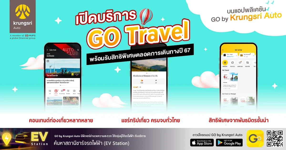 กรุงศรี ออโต้ ผู้นำธุรกิจสินเชื่อยานยนต์ครบวงจร เครือธนาคารกรุงศรีอยุธยา จำกัด (มหาชน) เปิดบริการ GO Travel ฟีเจอร์ใหม่ล่าสุด ภายใต้ Auto Club บนแอปพลิเคชัน GO by Krungsri Auto เพื่อให้ผู้ใช้รถได้ขับรถเที่ยวไทยและสัมผัสประสบการณ์การท่องเที่ยวพร้อมรับสิทธิพิเศษจากที่พัก, ร้านอาหาร และกิจกรรมท่องเที่ยวต่างๆ ที่ร่วมรายการ ภายใต้โครงการ Amazing ทุกเส้นทาง เมื่อเที่ยวเมืองไทยไปกับ กรุงศรี ออโต้ ซึ่งเป็นความร่วมมือกับการท่องเที่ยวแห่งประเทศ (ททท.) เปิดมิติใหม่ชวนผู้ใช้รถให้ขับรถเที่ยวไทยตลอดปี 2567 ผ่านแคมเปญ สุขทันที ที่เที่ยวกับ กรุงศรี ออโต้ เพื่อกระตุ้นการเติบโตของภาคอุตสาหกรรมการท่องเที่ยวในประเทศ