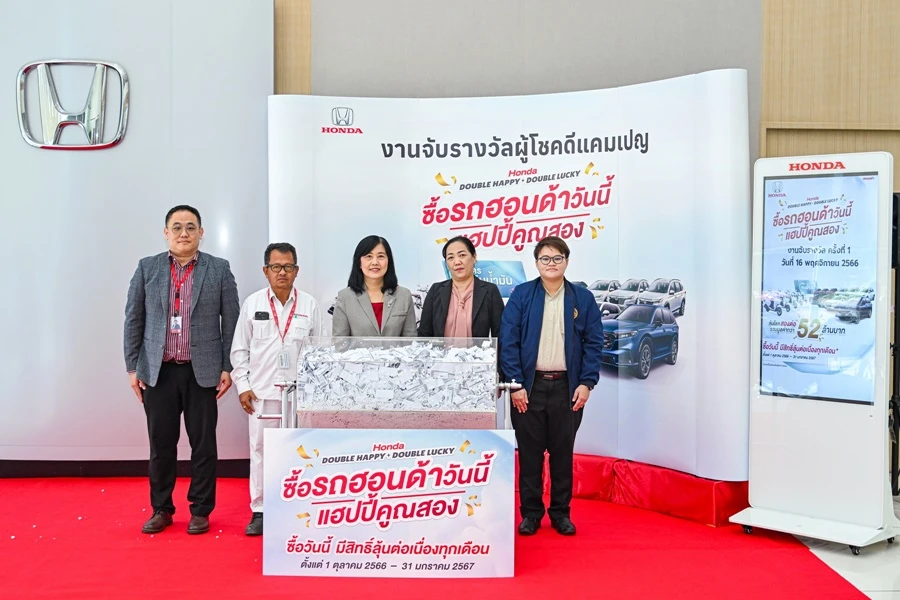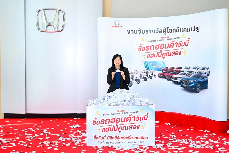 บริษัท ฮอนด้า ออโตโมบิล (ประเทศไทย) จำกัด ได้ทำการจับและมอบรางวัลให้แก่ผู้โชคดี จากแคมเปญ Honda Double Happy, Double Lucky ซื้อรถฮอนด้าวันนี้ แฮปปี้คูณสอง ให้ลูกค้าที่ซื้อและรับรถยนต์ฮอนด้ารุ่นใดก็ได้ ตั้งแต่วันที่ 1 ตุลาคม 2566 – 31 มกราคม 2567 โดยลูกค้าจะได้รับ 1 สิทธิ์ต่อการซื้อรถยนต์ 1 คัน เพื่อลุ้นรับรางวัล 2 ต่อ ยิ่งซื้อรถเร็ว ยิ่งมีสิทธิ์ลุ้นต่อเนื่องมากกว่า โดยต่อที่ 1 ลุ้นรับบัตรน้ำมันมูลค่า 20,000 บาท หรือ 10,000 บาท โดยมีจำนวนเพิ่มขึ้นในทุกเดือน รวม 3,000 รางวัล หากลูกค้ายังไม่ได้รับโชคในครั้งแรก ลูกค้าจะสามารถลุ้นได้ใหม่ทุกเดือนตลอดแคมเปญ และต่อที่ 2 ลูกค้าทุกคนมีสิทธิ์ลุ้นรางวัลใหญ่รวม 30 รางวัล ได้แก่ รถยนต์ฮอนด้าเอสยูวี 4 รุ่น จำนวน 10 คัน และรถจักรยานยนต์ ฮอนด้า จีออโน่ พลัส (GIORNO+) รุ่น ABS จำนวน 20 คัน รวมรางวัลทั้งสิ้น 3,030 รางวัล มูลค่ากว่า 52 ล้านบาท