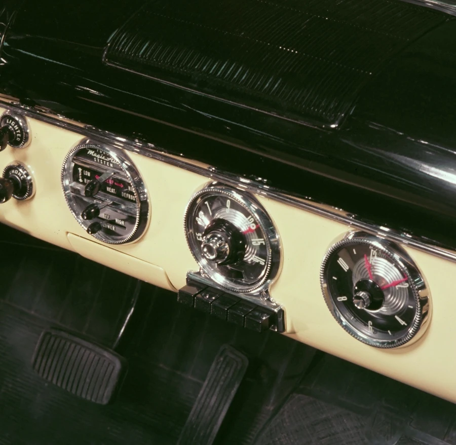 รถฟอร์ดรุ่นปี 1955 มีแผงหน้าปัดรถยนต์แบบ Astra-dial พร้อม หน้าปัดวิทยุรูปวงกลม รับกับแผงควบคุมเครื่องปรับอากาศและนาฬิกา