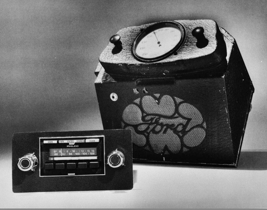 ในปี พ.ศ. 2477 ฟอร์ดติดตั้งวิทยุขนาดกะทัดรัดจาก Philco และได้ร่วมกันพัฒนาเครื่องรับสัญญาณที่ ออกแบบให้ติดตั้งบริเวณกลางแผงหน้าปัดรถยนต์แทนที่เขี่ยบุหรี่