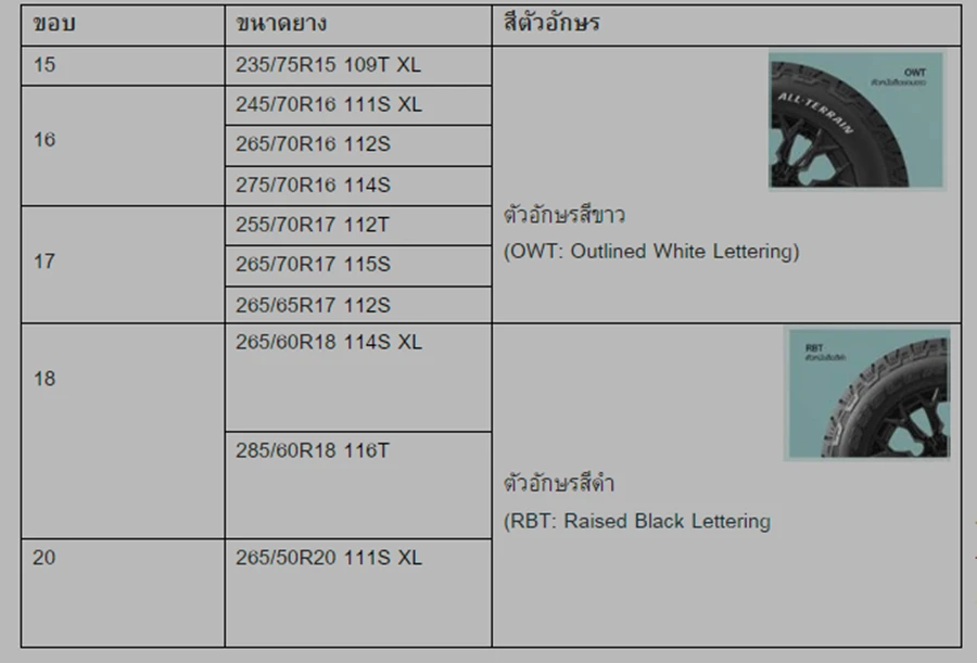 ผลิตภัณฑ์ BRIDGESTONE DUELER ALL-TERRAIN A/T002 มีให้เลือกตั้งแต่ขอบ 15-20 นิ้ว รวม 10 ขนาด ดังนี้