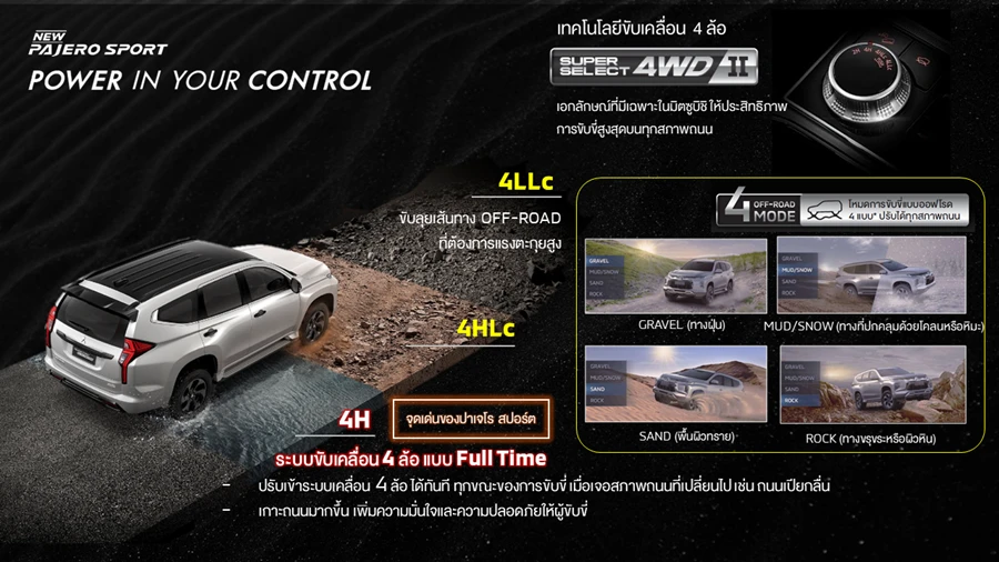 มิตซูบิชิ ปาเจโร สปอร์ต รุ่นขับเคลื่อน 4 ล้อ Elite Edition พร้อมเดินทางสู่จุดหมายในทุกสภาพอากาศและสภาพถนนทุกรูปแบบ ด้วยระบบขับเคลื่อน ซูเปอร์ซีเล็คต์ โฟร์วีลไดร์ฟ ทู (Super Select 4WD II) เอกลักษณ์เฉพาะของมิตซูบิชิ มอเตอร์ส ซึ่งสามารถปรับเข้าสู่โหมดการขับเคลื่อน 4 ล้อแบบฟูลไทม์ (4H Full-time) ได้ทันที แม้ในขณะขับขี่ด้วยความเร็ว (Shift-on-the-Fly)