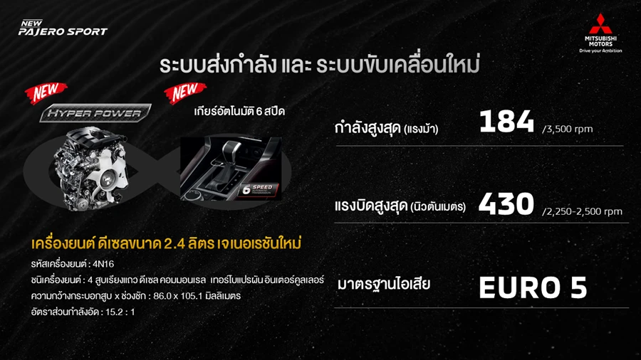ด้วยสโลแกน Power in Your Control ไปสู่ทุกจุดหมายด้วยพลังการควบคุมที่เหนือระดับ มิตซูบิชิ ปาเจโร สปอร์ต ใหม่! รุ่นปี 2024 มาพร้อมขุมกำลังใหม่ ไฮเปอร์พาวเวอร์ (Hyper Power) เครื่องยนต์ดีเซลคอมมอนเรล วีจี เทอร์โบ อินเตอร์คูลเลอร์ เทอร์โบ 4 สูบ ความจุ 2.4 ลิตร พร้อมหัวฉีดอิเล็กทรอนิกส์แบบคอมมอนเรลเจเนอเรชันใหม่ ทรงพลังและเป็นมิตรกับสิ่งแวดล้อมด้วยมาตรฐานไอเสียระดับยูโร 5 (Euro 5)