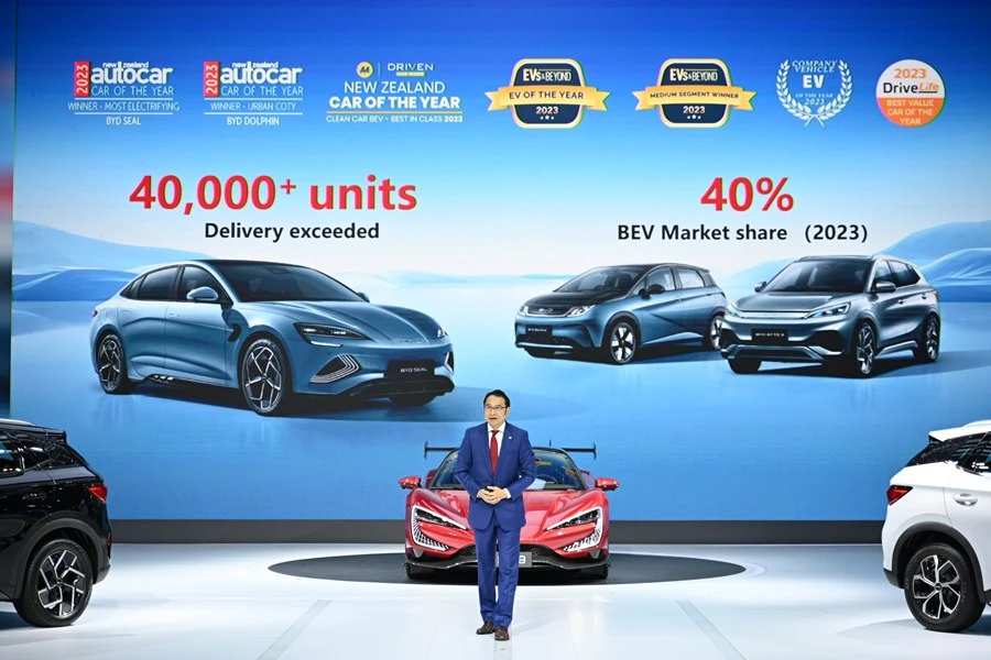นายหลิว เสวียเลี่ยง ผู้จัดการทั่วไป ฝ่ายขายประจำภูมิภาคเอเชียแปซิฟิก บริษัท บีวายดี ออโต้ อินดัสทรี จำกัด กล่าวว่า “สำหรับงานบางกอก อินเตอร์เนชั่นแนล มอเตอร์โชว์ ครั้งที่ 45 นี้ BYD มาพร้อมทัพยนตรกรรมที่อัดแน่นด้วยดีไซน์และนวัตกรรมล้ำสมัยทั้งจาก BYD นำโดย New BYD ATTO 3 Extended รุ่นปี 2024 ร่วมด้วยแบรนด์ BAO 5, DENZA และ YANGWANG ซึ่งพร้อมให้ชาวไทยได้สัมผัสคันจริงแล้ววันนี้ ในบูธ BYD กับพื้นที่กว่า 2,500 ตารางเมตร นับเป็นบูธภายใต้แบรนด์เดียวขนาดใหญ่ที่สุดในงาน รองรับการจัดแสดงรถยนต์พลังงานไฟฟ้ามากถึง 29 คัน และอีกหนึ่งความพิเศษในปีนี้ คือการพลิกโฉมบูธด้วยการตกแต่งในธีมฟุตบอล UEFA EURO 2024 ในฐานะที่ BYD เป็นผู้สนับสนุนหลักอย่างเป็นทางการของการแข่งขันฟุตบอลชิงแชมป์แห่งชาติยุโรป 2024 โดย BYD ยังเตรียมของสมนาคุณสุดพิเศษมามอบให้ลูกค้าอีกด้วย”