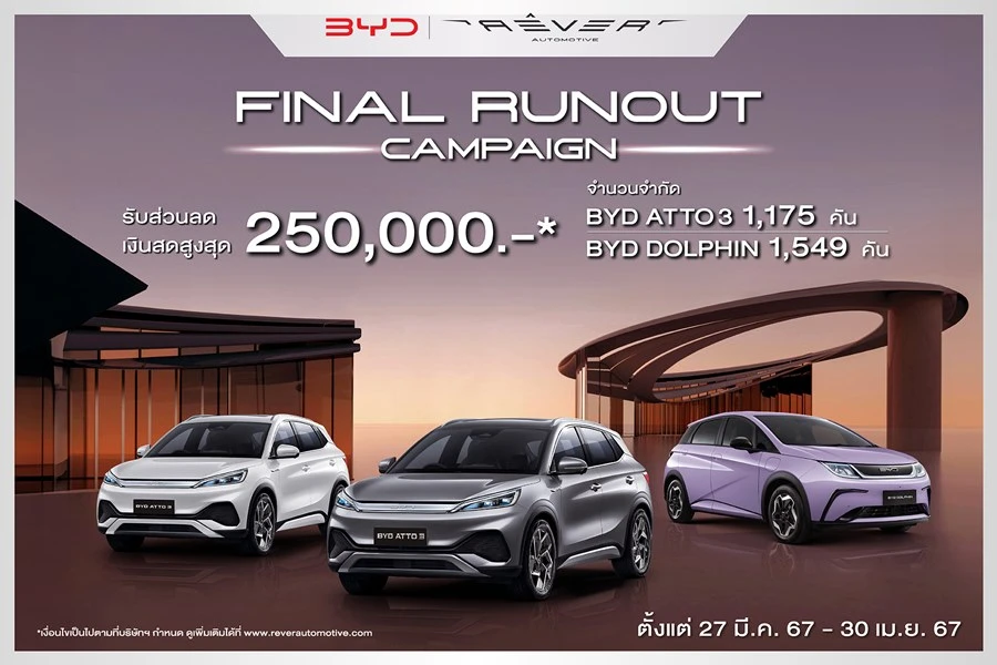 เรเว่ ออโตโมทีฟ มอบข้อเสนอสุดเอ็กซ์คลูซีฟสำหรับลูกค้าและผู้ที่สนใจซื้อรถยนต์ไฟฟ้า BYD ATTO 3 รุ่นปี 2023 (จำนวนจำกัด 1,175 คัน) และ BYD DOLPHIN (จำนวนจำกัด 1,549 คัน) รับส่วนลดเงินสดสูงสุด 250,000 บาท ตั้งแต่วันที่ 27 มีนาคม พ.ศ. 2567 – 30 เมษายน พ.ศ. 2567 โดยมีรายละเอียดดังนี้