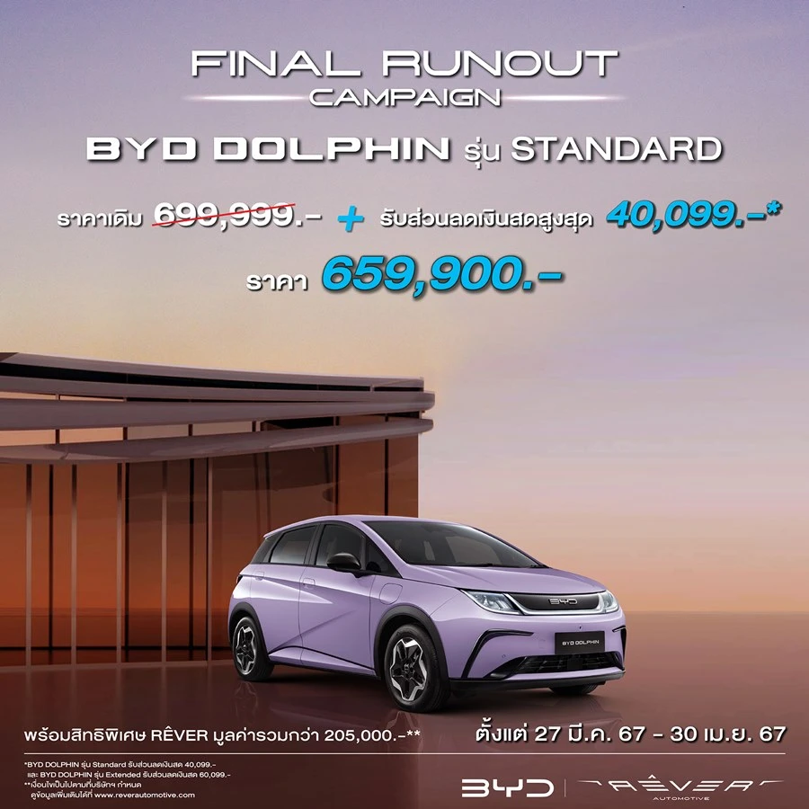 - ลูกค้าที่ซื้อ BYD DOLPHIN รุ่น Standard รับส่วนลดเงินสด 40,099 บาท เหลือเพียง 659,900 บาท (จากราคาปกติ 699,999 บาท) พร้อมสิทธิพิเศษ RÊVER มูลค่ารวมกว่า 205,000 บาท