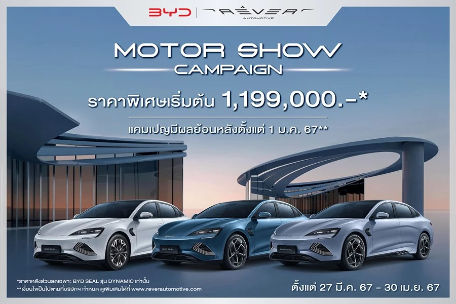 เรเว่ ออโตโมทีฟ จัดเต็มโปรโมชันต้อนรับงานมอเตอร์โชว์ สำหรับลูกค้าที่ซื้อ BYD SEAL ทุกรุ่น ตั้งแต่วันที่ 27 มีนาคม พ.ศ. 2567 – 30 เมษายน พ.ศ. 2567 (แคมเปญมีผลย้อนหลังเริ่มตั้งแต่วันที่ 1 มกราคม พ.ศ. 2567) โดยมีรายละเอียดดังนี้