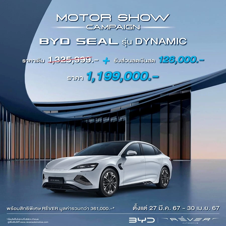 - ลูกค้าที่ซื้อ BYD SEAL รุ่น Dynamic รับส่วนลดเงินสด 126,000 บาท เหลือเพียง 1,199,000 บาท (จากราคาปกติ 1,325,999 บาท) พร้อมสิทธิพิเศษ RÊVER มูลค่ารวมกว่า 361,000 บาท