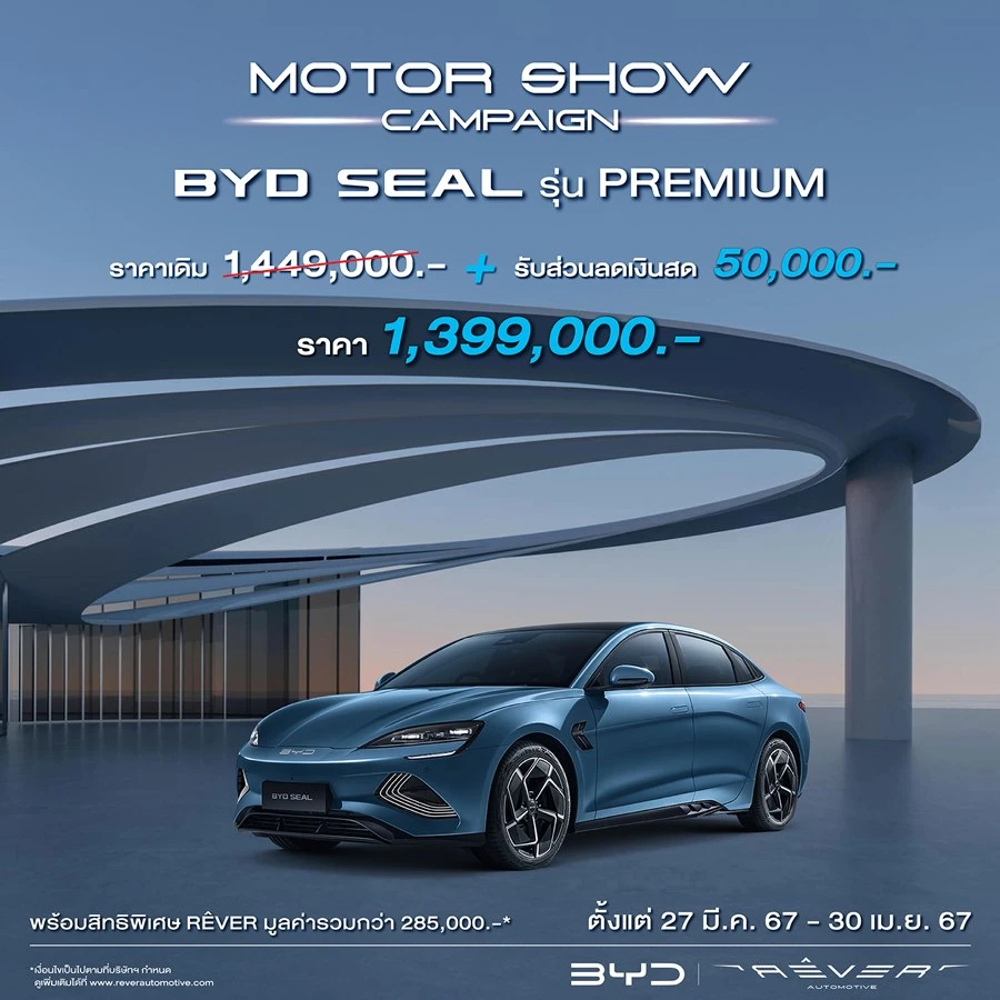 - ลูกค้าที่ซื้อ BYD SEAL รุ่น Premium รับส่วนลดเงินสด 50,000 บาท เหลือเพียง 1,399,000 บาท (จากราคาปกติ 1,449,000 บาท) พร้อมสิทธิพิเศษ RÊVER มูลค่ารวมกว่า 285,000 บาท