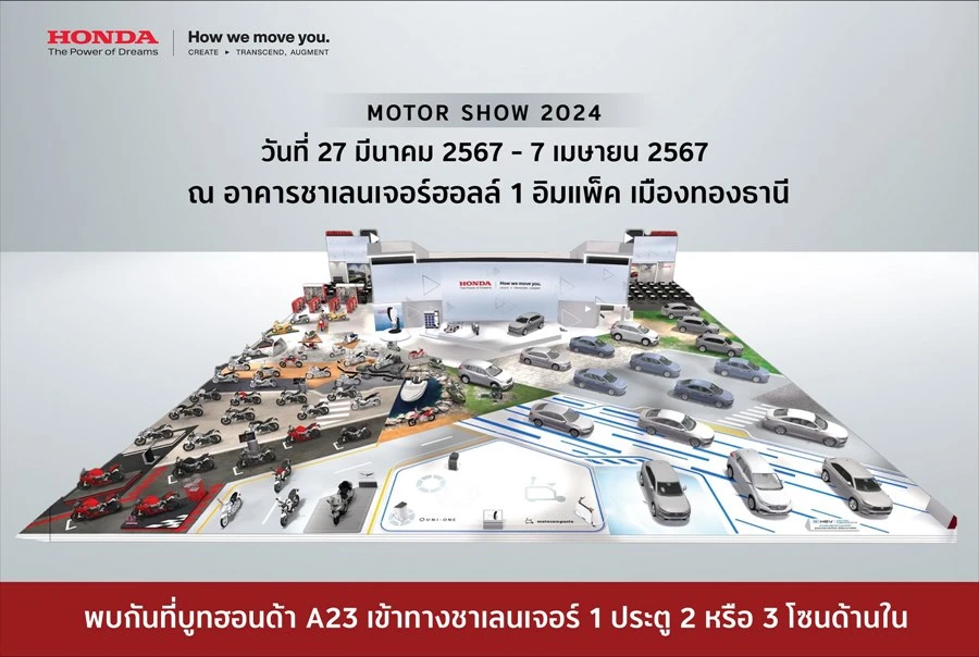 ฮอนด้า โดย บริษัท ฮอนด้า ออโตโมบิล (ประเทศไทย) จำกัด และบริษัท ไทยฮอนด้า จำกัด ผนึกกำลังจัดแสดงไลน์อัปทุกผลิตภัณฑ์ภายใต้แบรนด์ฮอนด้าในประเทศไทย ทั้งรถยนต์ รถจักรยานยนต์ เครื่องยนต์อเนกประสงค์ พร้อมเทคโนโลยีการขับเคลื่อนใหม่ ในงาน Motor Show 2024 ตอกย้ำความเป็นแบรนด์ที่แข็งแกร่งใประเทศไทย โดยภายในบูทมีการแบ่งโซนจัดแสดงตามกลุ่มผลิตภัณฑ์ของฮอนด้าเพื่อความสะดวกในการเข้าชม
