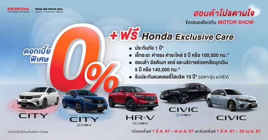 โดยแต่ละรุ่นมาพร้อมข้อเสนอพิเศษ*** กับ ‘ฮอนด้าโปรตามใจ’ ไม่ว่าจะเป็น ดอกเบี้ยพิเศษเริ่มต้น 0% พร้อม ฮอนด้า เอ็กซ์คลูซีฟ แคร์ (Honda Exclusive Care) หรือทางเลือก ดับเบิ้ล สไมล์ พลัส** ดาวน์เริ่มต้นน้อย ผ่อนต่อเดือนต่ำ เสริมความมั่นใจยิ่งขึ้นสำหรับรุ่น e:HEV ด้วยการรับประกันอายุการใช้งานแบตเตอรี่ไฮบริดถึง 10 ปี และรับประกันระบบไฮบริดทั้งระบบ 5 ปี ไม่จำกัดระยะทาง สำหรับลูกค้าที่จองตั้งแต่ 1 มีนาคม 2567 - 8 เมษายน 2567 และรับรถตั้งแต่ 1 มีนาคม 2567 - 30 เมษายน 2567