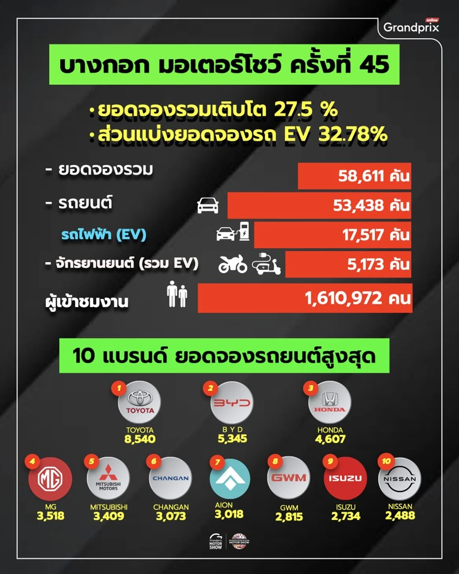 นายจาตุรนต์ โกมลมิศร์ ประธานเจ้าหน้าที่ปฏิบัติการ บริษัท กรังด์ปรีซ์ อินเตอร์เนชั่นแนล จำกัด (มหาชน) ในฐานะรองประธานจัดงาน บางกอก อินเตอร์เนชั่นแนล มอเตอร์โชว์ ครั้งที่ 45 เปิดเผยว่า “เนื่องจากการจัดงานในปีนี้ มีผู้ประกอบการรายใหม่ๆ เข้าร่วมงานเป็นจำนวนมาก โดยเฉพาะผู้ประกอบการจากประเทศจีนและเวียดนาม ที่นำรถยนต์ไฟฟ้ารุ่นใหม่ๆ เข้ามาให้ผู้บริโภค เลือกชม เลือกซื้อ เป็นจำนวนมาก โดยมีราคาตั้งแต่หลักแสนปลายๆ ไปจนถึงหลักล้านต้นๆ ทำให้มีผู้บริโภคให้ความสนใจเข้าร่วมงานมากถึง 1,610,972 คน ส่งผลให้ยอดจองรถยนต์และรถจักรยานยนต์ภายในงานมีมากกว่า 58,611 คัน แบ่งเป็น รถจักรยานยนต์ 5,173 คัน และรถยนต์ 53,438 คัน โดยมากกว่า 32.78 เปอร์เซ็นต์ เป็นยอดจองรถยนต์ไฟฟ้าที่เกิดขึ้นภายในงาน”
