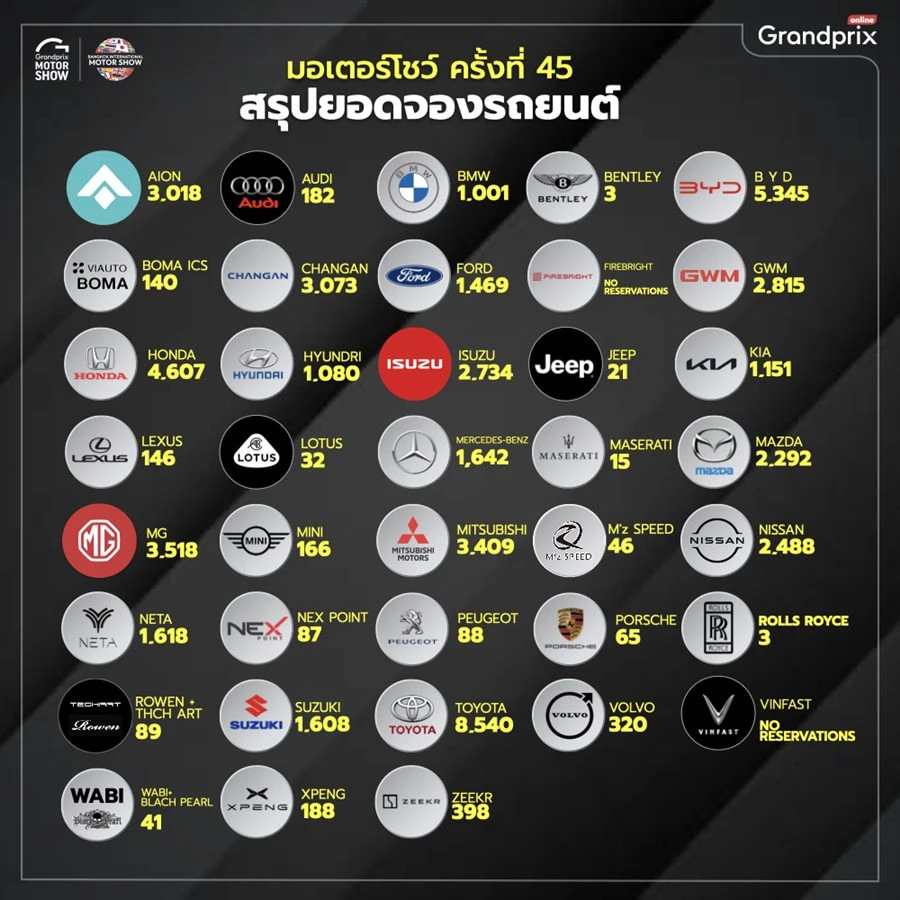 “ทั้งนี้รถรถยนต์ไฟฟ้าจากประเทศจีนได้รับความสนใจจากประชาชน เช่นเดียวกับรถยนต์ไฟฟ้าจากค่ายยุโรป ไม่ว่าจะเป็นเมอร์เซเดส-เบนซ์ บีเอ็มดับเบิ้ลยู และวอลโว่ โดยมียอดจองรวมกันกว่า 17,517 คัน คิดเป็นส่วนแบ่งกว่า 32.78 เปอร์เซ็นต์ ขณะที่รถยนต์ที่ใช้เครื่องยนต์สันดาปภายในเป็นส่วนประกอบก็ยังคงมีสัดส่วนยอดจองกว่า 35,921 คัน”