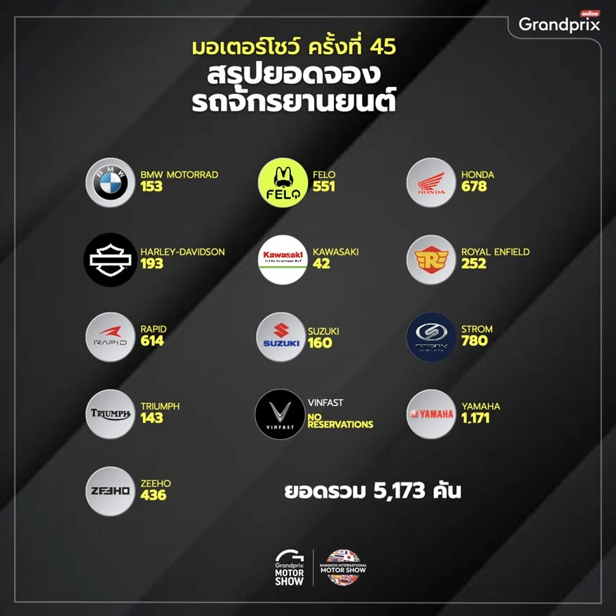 ขณะที่รถจักรยานยนต์ในปีนี้มีแบรนด์จากประเทศจีนเข้าร่วมงานถึง 5 แบรนด์ ซึ่งเป็นรถจักรยานยนต์ไฟฟ้าที่ได้รับความสนใจจากผู้เข้าชมงานไม่น้อยเช่นกัน ทำให้มียอดจองรถจักรยานยนต์ภายในงานรวมทั้งสิ้น 5,173 คัน