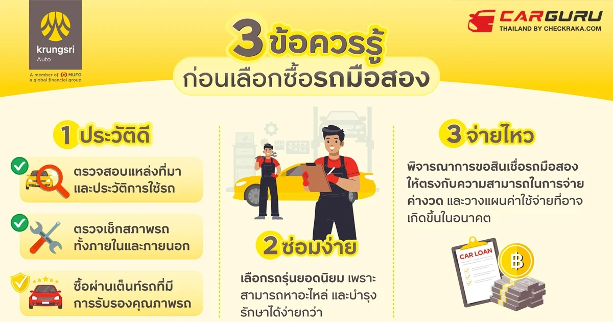 กรุงศรี ออโต้ ผู้นำธุรกิจสินเชื่อยานยนต์ครบวงจร เครือธนาคารกรุงศรีอยุธยา จำกัด (มหาชน) ได้ให้แนวทางการเลือกรถมือสองอย่างชาญฉลาด ด้วยหลัก 3 ข้อ ประวัติดี-ซ่อมง่าย-จ่ายไหว เพื่อให้รถมือสองได้กลายมาเป็นอีกหนึ่งทุนตั้งต้นชีวิตหรือฟันเฟืองหลักในการสร้างชีวิตใหม่ของผู้ใช้รถในประเทศไทย