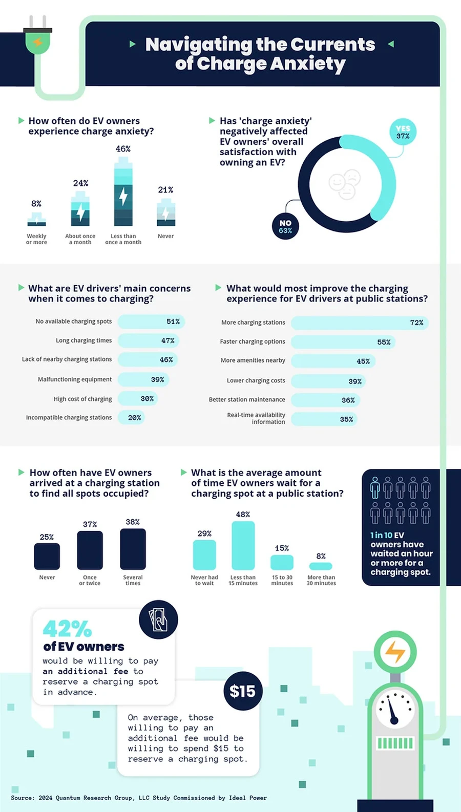 หนึ่งในข้อกังวลที่ใหญ่ที่สุดสำหรับเจ้าของรถ EV คือการไปที่สถานีชาร์จแล้วไม่พบจุดชาร์จที่ว่างเลย ซึ่งเจ้าของรถอีวีกว่า 75% กล่าวว่าสิ่งนี้เกิดขึ้นกับพวกเขาอย่างน้อยหนึ่งครั้ง และ 10% ของผู้ที่ตอบคำถามกล่าวว่าพวกเขาเคยต้องรอชาร์จเป็นเวลา 1 ชม.หรือมากกว่า แต่ส่วนใหญ่แล้ว ค่าเฉลี่ยของการรอชาร์จจะอยู่ที่ 15 นาทีหรือน้อยกว่า