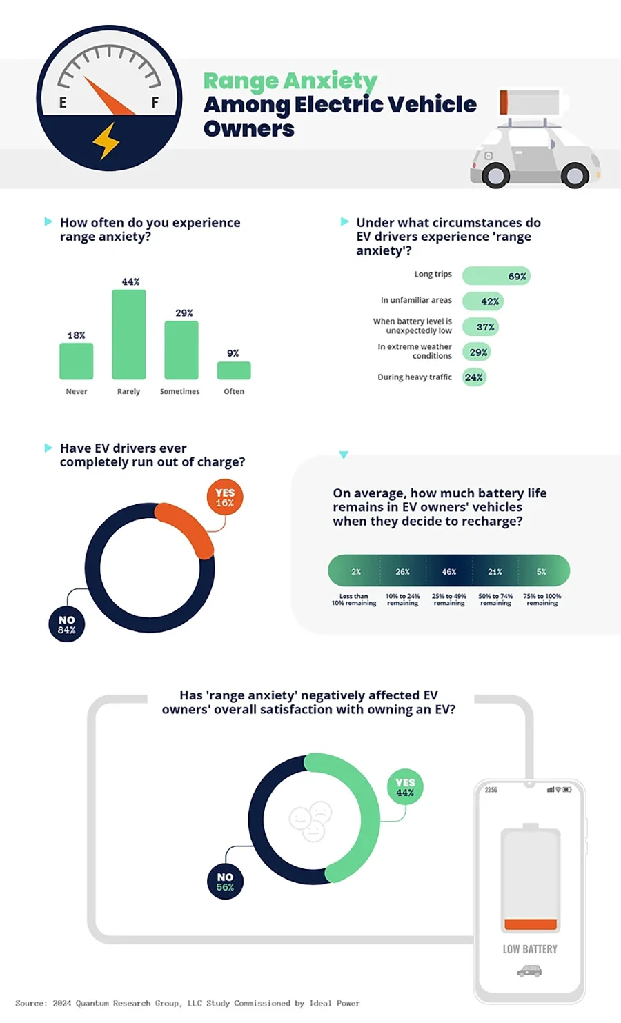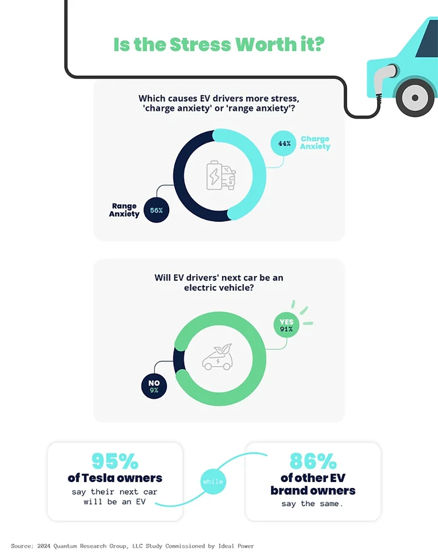 ทุกวันนี้รถยนต์ไฟฟ้าเพิ่มจำนวนขึ้นอย่างรวดเร็ว มาพร้อมกับความกังวลในเรื่องต่าง ๆ เพิ่มขึ้นมา ทั้งระยะทางขับขี่ ไปจนถึงสถานีชาร์จ Ideal Power จึงต้องการศึกษาเกี่ยวกับเรื่องนี้ และต้องการเข้าใจว่าความกังวลเหล่านี้มีมากน้อยเพียงใด โดย Quantum Research Group เป็นผู้ดำเนินการวิจัย