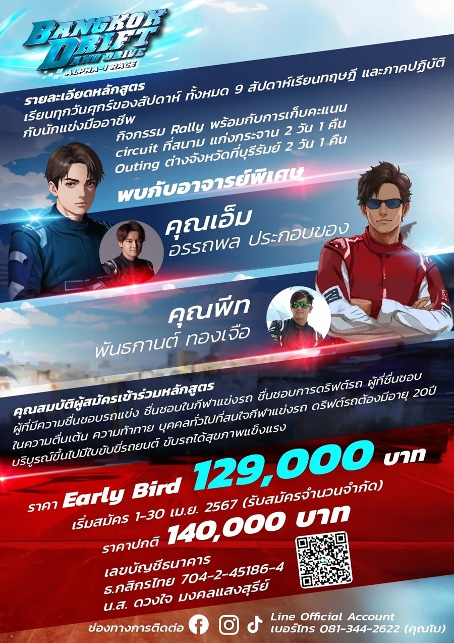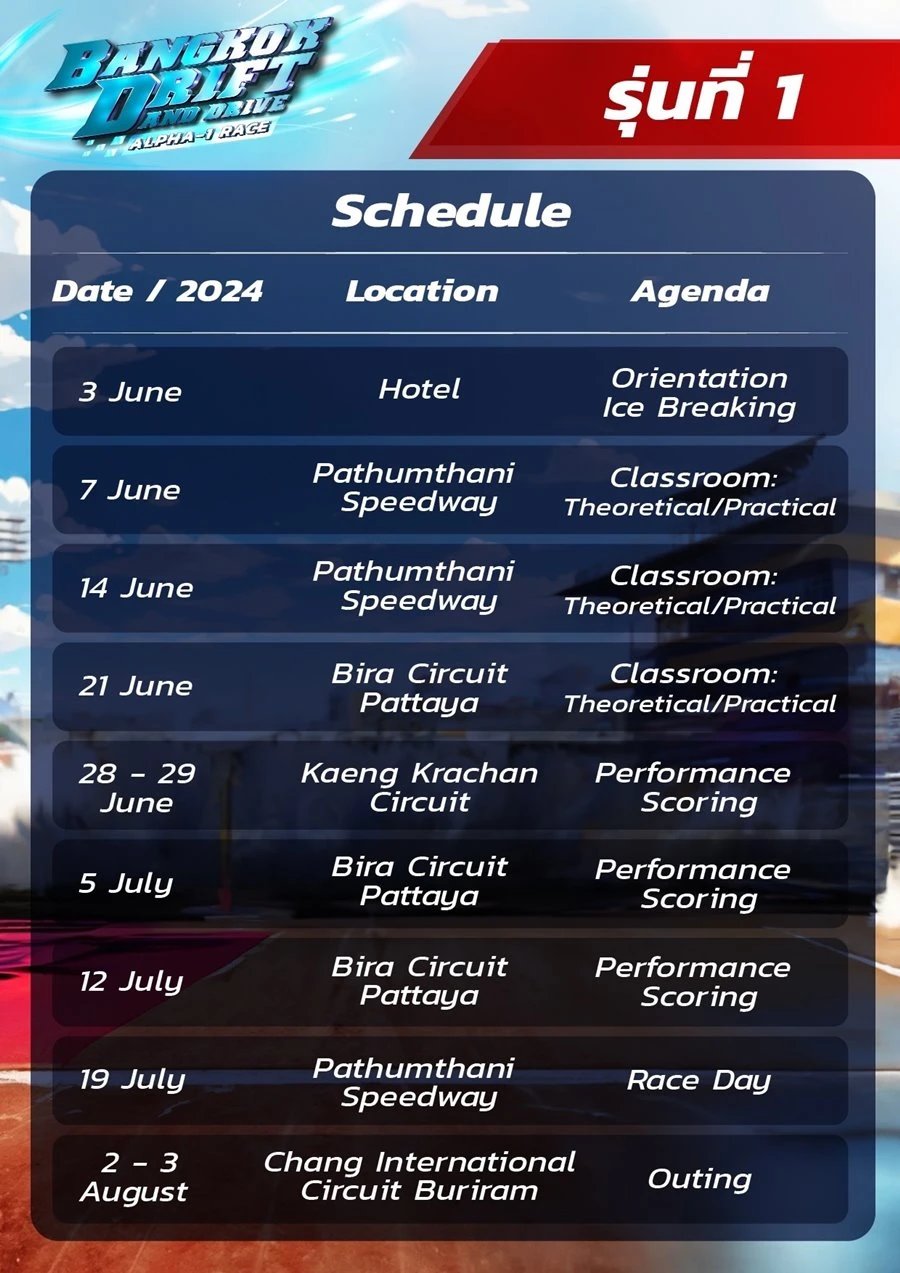 สำหรับผู้ที่สนใจ สามารถสมัครเข้ามาเป็น Bangkok Drift and Drive : Alpha-1 Race รุ่น 1 กันได้ โดยจะมีการเรียนทุกวันศุกร์ของสัปดาห์ ทั้งหมด 9 สัปดาห์ เริ่ม 3 มิถุนายน – 3 สิงหาคม 2567 (รวมทริปต่างจังหวัด 2 ครั้ง และพิธีเปิด / พิธีปิดหลักสูตรฯ)
