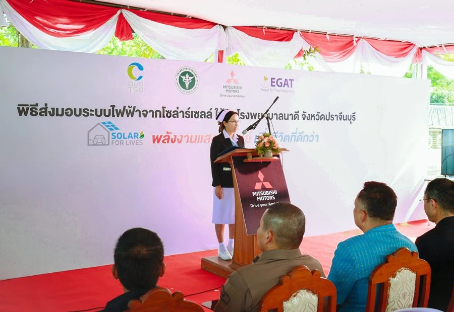 มิตซูบิชิ มอเตอร์ส ประเทศไทย เดินหน้าส่งมอบระบบไฟฟ้าจากโซล่าร์เซลล์แก่ โรงพยาบาลนาดี จังหวัดปราจีนบุรี ซึ่งเป็นโรงพยาบาลแห่งที่ 9 ภายใต้โครงการ Solar For Lives : พลังงานแสงอาทิตย์ เพื่อชีวิตที่ดีกว่า โดยมี มร. เออิจิ โอกาวะ (ที่ 3 จากซ้าย) กรรมการรองผู้จัดการใหญ่ สายงานผลิต มิตซูบิชิ มอเตอร์ส ประเทศไทย พร้อมด้วย นางพัชรี โฆษิตวรกิจกุล (ที่ 4 จากซ้าย) ผู้ช่วยกรรมการผู้จัดการใหญ่ สายงานห่วงโซ่อุปทาน มิตซูบิชิ มอเตอร์ส ประเทศไทย ร่วมส่งมอบระบบไฟฟ้าจากโซล่าร์เซลล์ แก่โรงพยาบาลนาดี จังหวัดปราจีนบุรี ภายใต้โครงการ Solar For Lives : พลังงานแสงอาทิตย์ เพื่อชีวิตที่ดีกว่า เพื่อมุ่งสนับสนุนการใช้พลังงานสะอาดในด้านสาธารณสุข และส่งเสริมให้ประเทศไทยก้าวสู่สังคมคาร์บอนเป็นกลาง โดยมี นางวิไลรัตน์ โยธาพันธ์ (ซ้ายสุด) หัวหน้ากลุ่มการพยาบาล โรงพยาบาลนาดี เป็นตัวแทนรับมอบ พร้อมด้วย นายทนงค์ ดวงมุกพะเนาว์ (ที่ 2 จากซ้าย) รองนายแพทย์สาธารณสุข จังหวัดปราจีนบุรี, นายธรรมรัฏฐ์ งามแสง (ที่5 จากซ้าย) นายอำเภอนาดี จังหวัดปราจีนบุรี และ นายนำพล โพธิวงศ์ (ที่ 5 จากขวา) ผู้อำนวยการฝ่ายกลยุทธ์ความยั่งยืน การไฟฟ้าฝ่ายผลิตแห่งประเทศไทย ร่วมเป็นสักขีพยาน