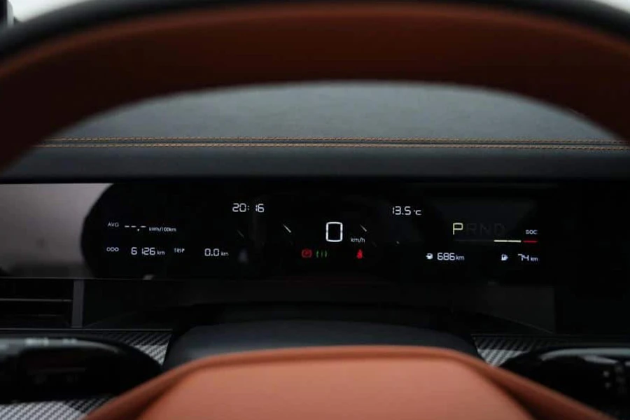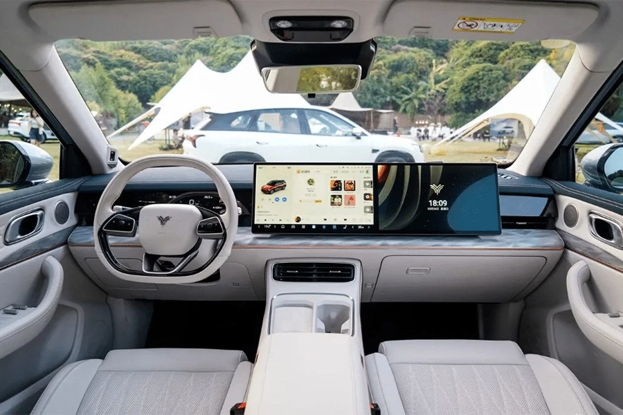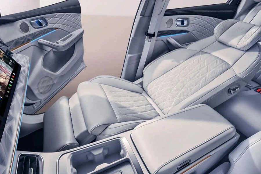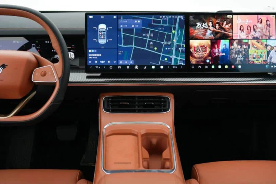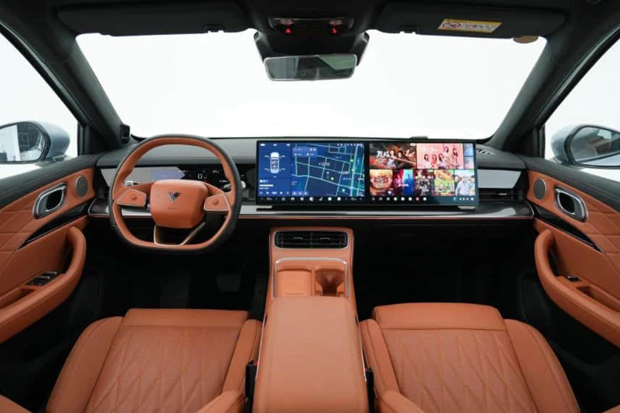 ภายในห้องโดยสารมีให้เลือกทั้งหมด 2 สี ได้แก่ สีส้ม และสีขาว เราจะเห็นหน้าจอขนาด 15.6 นิ้วถึง 2 จอ ซึ่งประกอบเข้าด้วยกัน โดยตรงกลางจะเป็นจอ infotainment ทั่วไป ส่วนอีกจอจะเป็นความบันเทิงสำหรับผู้โดยสารด้านข้าง ทั้งหมดนี้ขับเคลื่อนด้วยชิป Qualcomm Snapdragon 8155