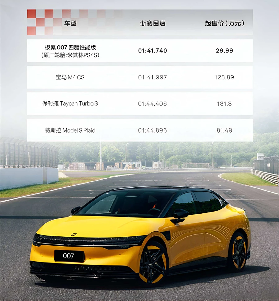 Zeekr แบรนด์หรูจาก Geely ประกาศว่า Zeekr 007 Performance สามารถทำเวลาบนสนาม Zhejiang International Circuit ได้ที่ 1:41.740 จึงได้เป็นรถยนต์ไฟฟ้าที่เร็วที่สุดอันดับ 5 เอาชนะ Xiaomi SU7, Porsche Taycan Turbo S และ Tesla Model S Plaid และได้อันดับที่ 48 จากทั้งหมดสำหรับสนามนี้