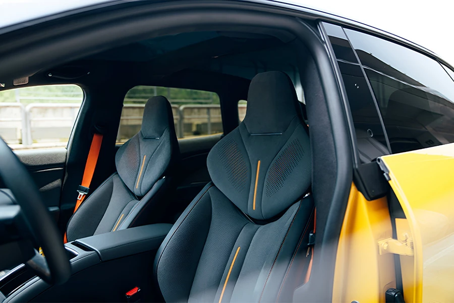 ในรุ่นนี้ยังมาพร้อมสีเหลือง “Kung Fu Yellow” ที่ด้านนอก ภายในตกแต่งด้วยหนัง suede พร้อมตะเข็บสีส้ม เบาะหน้าแบบรถแข่งปรับไฟฟ้าได้ 18 ทิศทาง ห้องโดยสารดีไซน์แบบ HMI interface