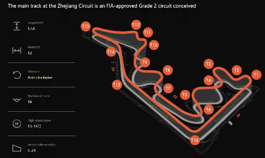 สำหรับสนาม Zhejiang Circuit ออกแบบโดย Apex Circuit Design ที่ถูกรับรองโดย FIA เป็นสนาม Grade 2 มีความยาว 3.2 กิโลเมตร และมีการยกระดับที่ 22 เมตร สนามนี้สามารถแบ่งออกเป็น 2 สนามย่อย ได้แก่ ด้านตะวันตก และตะวันออก ตัวสนามมีทั้งหมด 16 โค้งที่มีองศาและระดับความสูงแตกต่างกัน