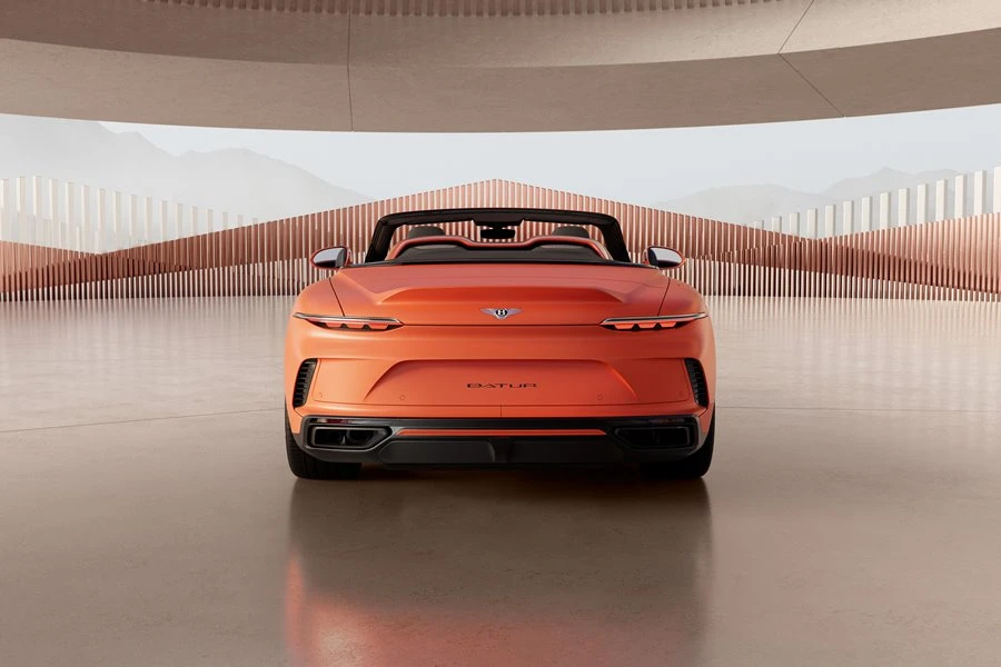 ด้านหน้าของ Batur Convertible Car #0 โดดเด่นด้วยกระจังหน้าที่รังสรรค์ขึ้นอย่างโดดเด่นด้วยดีไซน์เมทริกซ์แบบมันเงาในโทนสีเข้ม Gloss Dark Titanium เน้นด้วยการเล่นสีตัดกันในรูปแบบออมเบรแนวนอนที่ทอดยาวจากเฉดสีดำบริเวณตรงกลางและสว่างขึ้นสู่ด้านข้างด้วยเฉดสีส้มมันวาว Vermillion Gloss พร้อมด้วยเส้นสาย “endless bonnet” ที่เคลือบด้วย Gloss Dark Titanium เช่นเดียวกับล้ออัลลอยด์ที่ออกแบบพิเศษขนาด 22 นิ้วแบบมัน-ด้านในเฉดสีดำ Black Titanium กับการตกแต่งด้วยการเน้นเฉดสีส้ม Vermillion Gloss
