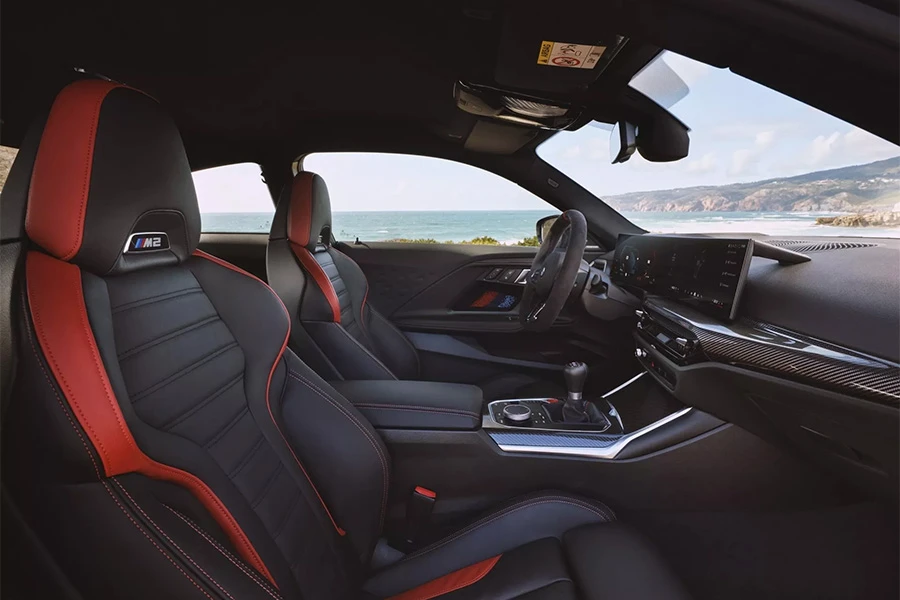 มากันที่ภายในของ M2 ใหม่กันบ้าง เราจะเห็นพวงมาลัยท้ายตัดดีไซน์ใหม่ที่เลือกได้ว่าจะเอาหุ้มหนังหรือ Alcantara (พร้อมออพชั่นระบบอุ่นให้เลือก) มีออพชั่นเป็นเบาะนั่งหุ้มหนัง Vernasca สีดำ พร้อมลายและตะเข็บสีแดง และยังสามารถเพิ่มเป็นเบาะบักเก็ตซีท M Carbon ได้อีกด้วย โดยจะสั่งพร้อมกับ Carbon Package หรือซื้อแยกก็ทำได้