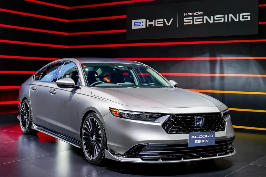 - ฮอนด้า แอคคอร์ด อี:เอชอีวี ใหม่ (รุ่น e:HEV E) มาพร้อมไฮไลต์ล้ออัลลอย MUGEN รุ่น MDC ขนาด 19x8.5 +45 สี Flat Black Mirror สไตล์ทูโทน และตกแต่งรอบคันด้วยชุดแต่งพิเศษเพื่อโชว์ไอเดียอัปลุคความสปอร์ตพรีเมียมให้โดดเด่นยิ่งขึ้น ตัวถังภายนอกมาพร้อมสติกเกอร์หุ้มรถสีเทาเงินเมทัลลิกแบบด้าน และหลังคาสติกเกอร์ตกแต่งหลังคาสีดำแบบด้าน พร้อมด้วยสเกิร์ตรอบคันสีเดียวกับตัวรถ ได้แก่ สเกิร์ตหน้า สเกิร์ตข้าง และสเกิร์ตหลัง ปลายท่อไอเสียคู่แบบสปอร์ต ยาง MICHELIN Pilot Sport 5 ขนาด 235/40/R19 พร้อมเปลี่ยนชุดแดมเปอร์ (Damper) ที่ลงตัวกับลุคสปอร์ตเท่ของพรีเมียมแฟลกชิปซีดาน (ตกแต่งเพื่อการจัดแสดง ไม่มีการจำหน่าย)