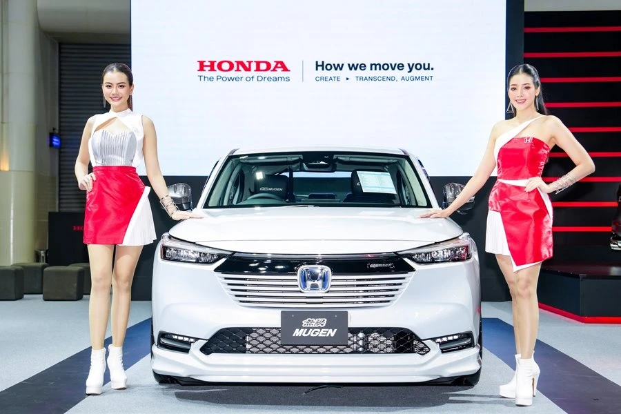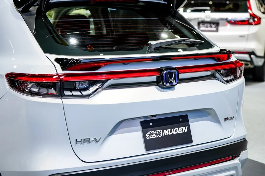 - ฮอนด้า เอชอาร์-วี อี:เอชอีวี (รุ่น e:HEV EL) กับชุดแต่ง MUGEN รอบคัน ยกระดับความแกร่งสไตล์สปอร์ตในแนวคิด ‘Sporty Energize with Aggressive Styling’ จัดเต็มรอบคันทั้งภายนอกและภายใน ผสานความไดนามิกและสปอร์ตแกร่งไว้อย่างลงตัว อาทิ ล้อ MUGEN รุ่น MF10 ขนาด 17x7.5 +52 สี Bronze Anodize ยาง Yokohama ADVAN NEOVA AD09 ขนาด 234/45/R17 สเกิร์ตรอบคัน ชุดตกแต่งกันชนหลัง ชุดตกแต่งกระจังหน้า-ไฟหน้า ด้านท้าย ดึงดูดสายตาด้วยสปอยเลอร์หลัง (แบบ Wing) และ สปอยเลอร์หลังแบบคาดเอว (Tailgate) ปลายท่อไอเสียทรงสปอร์ต ภายในมาพร้อมพรมปูพื้นห้องโดยสารและห้องบรรทุกสัมภาระในสีแดงสไตล์สปอร์ต ชุดหุ้มเบาะหนังที่เพิ่มความเท่ด้วยโทนสีสีดำสปอร์ตเดินด้ายสีแดง และปักลายแถบสี SHINDEN GO อันเป็นเอกลักษณ์ พร้อมโลโก้ MUGEN บนพนักพิงศีรษะ (ตกแต่งเพื่อการจัดแสดง ไม่มีการจำหน่าย)