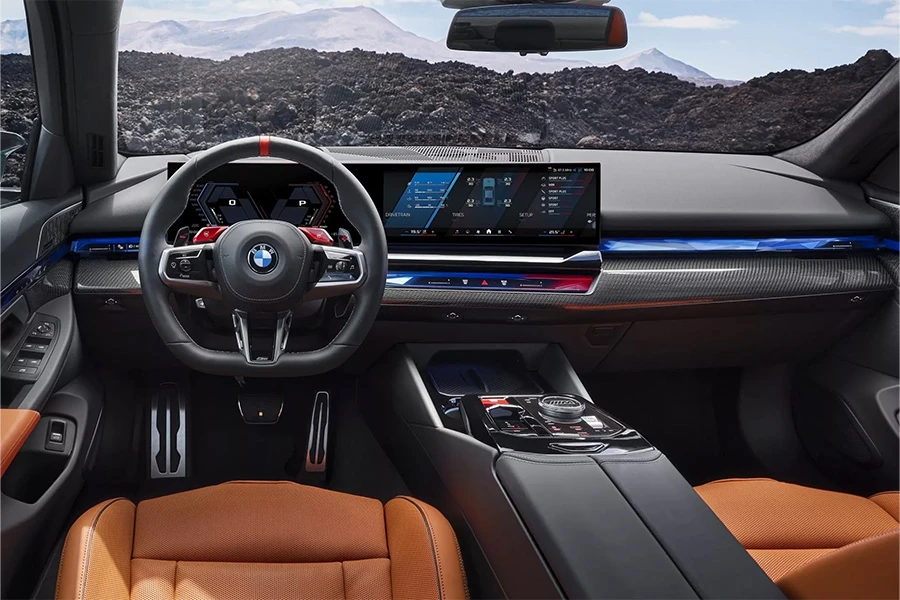 สำหรับภายในมีดีไซน์ส่วนใหญ่นำมาจาก 5 Series และ i5 ที่เปิดตัวไปก่อนหน้านี้ มาพร้อมหน้าจอมาตรวัดดิจิทัล 12.3 นิ้ว และหน้าจอกลางขนาด 14.9 นิ้ว นอกจากนี้ยังมีการตกแต่งด้วยพาร์ท M มากมาย ทั้งพวงมาลัย คอนโซล และอื่น ๆ ที่เป็นเอกลักษณ์ใน M5 รุ่นนี้ รวมถึงสามารถคัสตอมการตกแต่งหลายส่วนเพิ่มเติมอีกด้วย