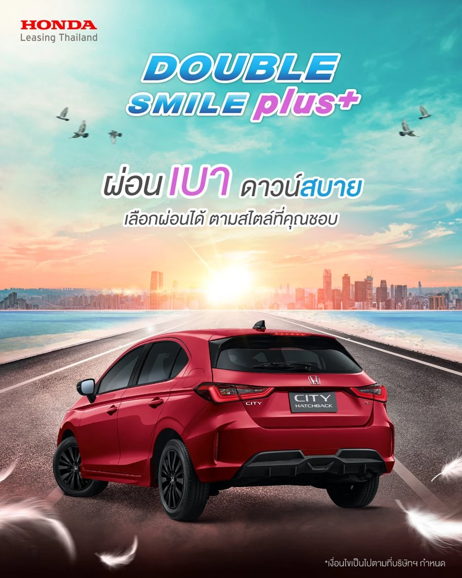 - ดับเบิ้ล สไมล์ พลัส ผ่อนเบา ดาวน์สบาย เลือกผ่อนได้ 4 ปี หรือ ผ่อน 5 ปี ได้ตามสไตล์ที่คุณชอบ ผ่อน 4 ปี ค่างวดเริ่มต้น 7,575 บาท / ผ่อน 5 ปี ค่างวดเริ่มต้น 7,265 บาท (คำนวณจาก ซิตี้ แฮทช์แบ็ก อี:เอชอีวี ใหม่ (เกรด e:HEV SV) เงื่อนไขดาวน์ 20%) หรือเลือกดาวน์ต่ำเพียง 10%