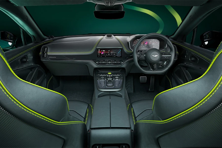 จากนั้นเราจะเห็นโลโก้ Aston Martin บนแผงหน้าปัด ขณะเดียวกันก็มีการสลักสัญลักษณ์ AMR24 ไว้ที่ธรณีประตู นอกจากนี้ยังมีสายถักด้วยมือตะเข็บสี Lime สำหรับแท่นชาร์จไร้สายที่ให้สัมผัสที่ดี