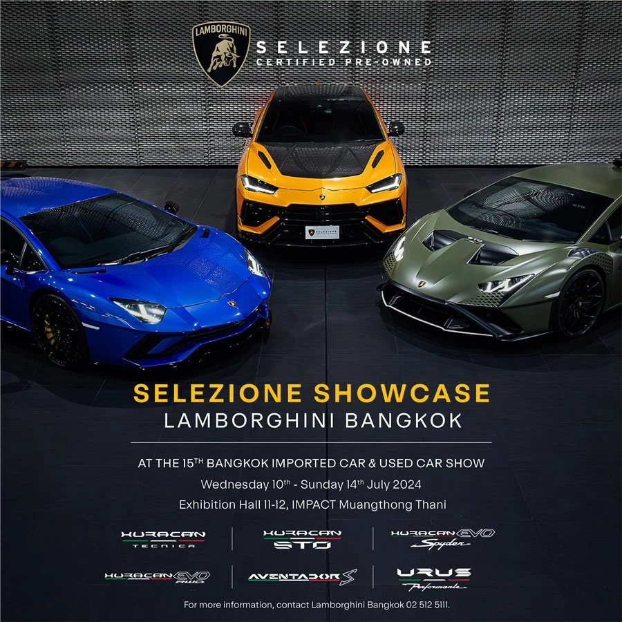 บริษัท เรนาสโซ มอเตอร์ จำกัด ตัวแทนจำหน่ายรถยนต์ลัมโบร์กินีอย่างเป็นทางการรายเดียวในประเทศไทย นำโดย อภิชาติ ลีนุตพงษ์ ประธานกรรมการ, ศักดิ์ นานา และ ม.ล.พลอยนภัส ลีนุตพงษ์ กรรมการ ยกทัพ Selezione Certified Pre-owned จัดแสดงในงาน Bangkok Imported Car & Used Car Show ครั้งที่ 15 พร้อมเผยโฉมลัมโบร์กินี Pre-owned ที่ได้รับการรับรองคุณภาพจากทางลัมโบร์กินีและมาตรฐานสูงสุดจากเรนาสโซ มั่นใจด้วยการตรวจสอบประวัติรถได้ทุกคัน มาพร้อมข้อเสนอสุดพิเศษเฉพาะในงาน อาทิ Huracán Tecnica, Huracán STO, Huracán EVO RWD, Aventador S, Huracán EVO Spyder และ Urus Performante ระหว่างวันที่ 10-14 กรกฎาคม 2567 ณ อิมแพ็ค อารีนา เมืองทองธานี, Exhibition Hall 11-12