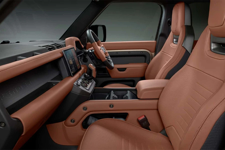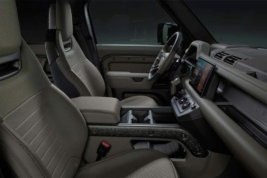 ห้องโดยสารของ Defender Octa มาพร้อมเบาะนั่ง Performance seats ใหม่ที่รองรับสรีระมากขึ้นพร้อมพนักพิงศีรษะที่เชื่อมกับส่วนรองหลัง และนำเสนอเทคโนโลยีระบบเสียง Body and Soul Seat ใน Defender เป็นครั้งแรก