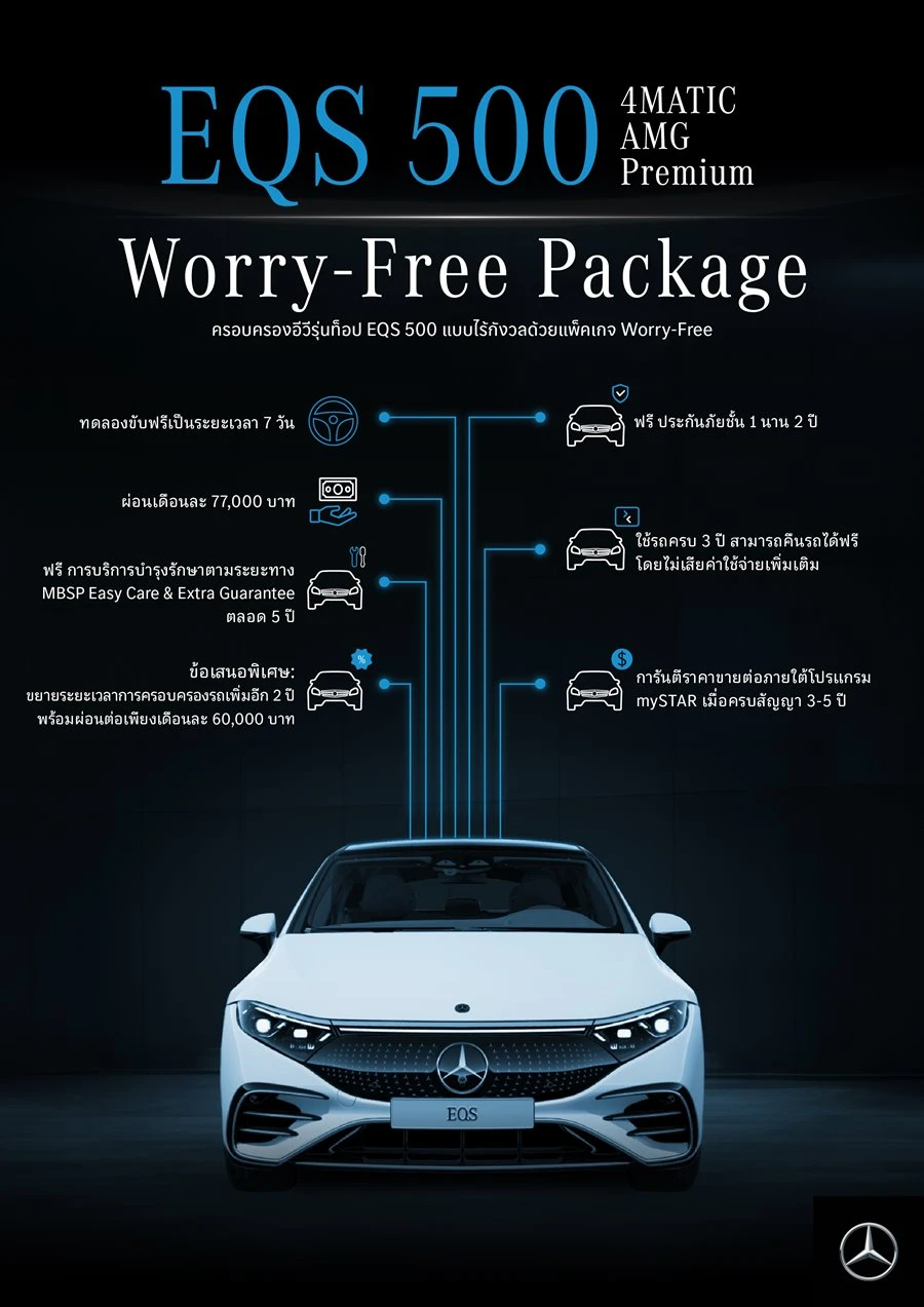เมอร์เซเดส-เบนซ์ ประเทศไทย ส่งแคมเปญเขย่าวงการยานยนต์ไฟฟ้าช่วงกลางปี มอบประสบการณ์อีกขั้นของการขับขี่ หมดกังวลเรื่องค่าใช้จ่ายแอบแฝงด้วย Worry-Free Package แพ็กเกจสุดเอ็กซ์คลูซีฟสำหรับรถยนต์รุ่น EQS 500 4MATIC AMG Premium โมเดลระดับ Top-End Luxury ของแบรนด์ ที่มาพร้อมข้อเสนอพิเศษต่าง ๆ มากมาย ไม่ว่าจะเป็น การทดลองขับฟรี นโยบายการเงิน นโยบายการคืนรถ และประกันภัยชั้นหนึ่งจากเมอร์เซเดส-เบนซ์ นานถึง 2 ปี ตอบโจทย์ทุกไลฟ์สไตล์การใช้ชีวิตและการขับขี่ของคนยุคใหม่ พร้อมเปิดทางเลือกให้อย่างเต็มที่ตามที่ลูกค้าต้องการ