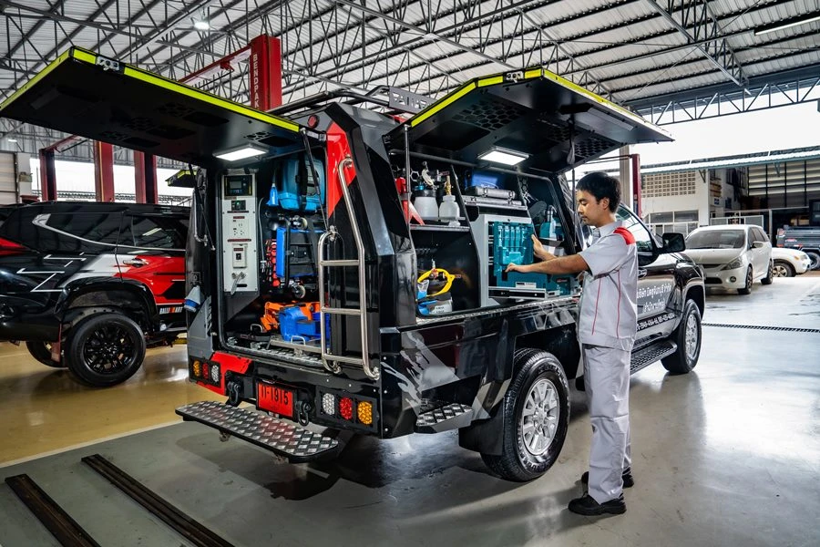 รถบริการนอกสถานที่ มิตซูบิชิ โมบายเซอร์วิส รุ่นใหม่ล่าสุดนี้ ได้รับการพัฒนาให้ดียิ่งขึ้นจากรุ่นแรกซึ่งเปิดตัวในปี 2562 โดยได้รับการติดตั้งอุปกรณ์และเครื่องมืออันทันสมัยเพิ่มเติมกว่า 60 รายการ จึงสามารถรองรับงานบริการได้หลากหลายรูปแบบยิ่งขึ้น ครอบคลุมบริการได้มากกว่า