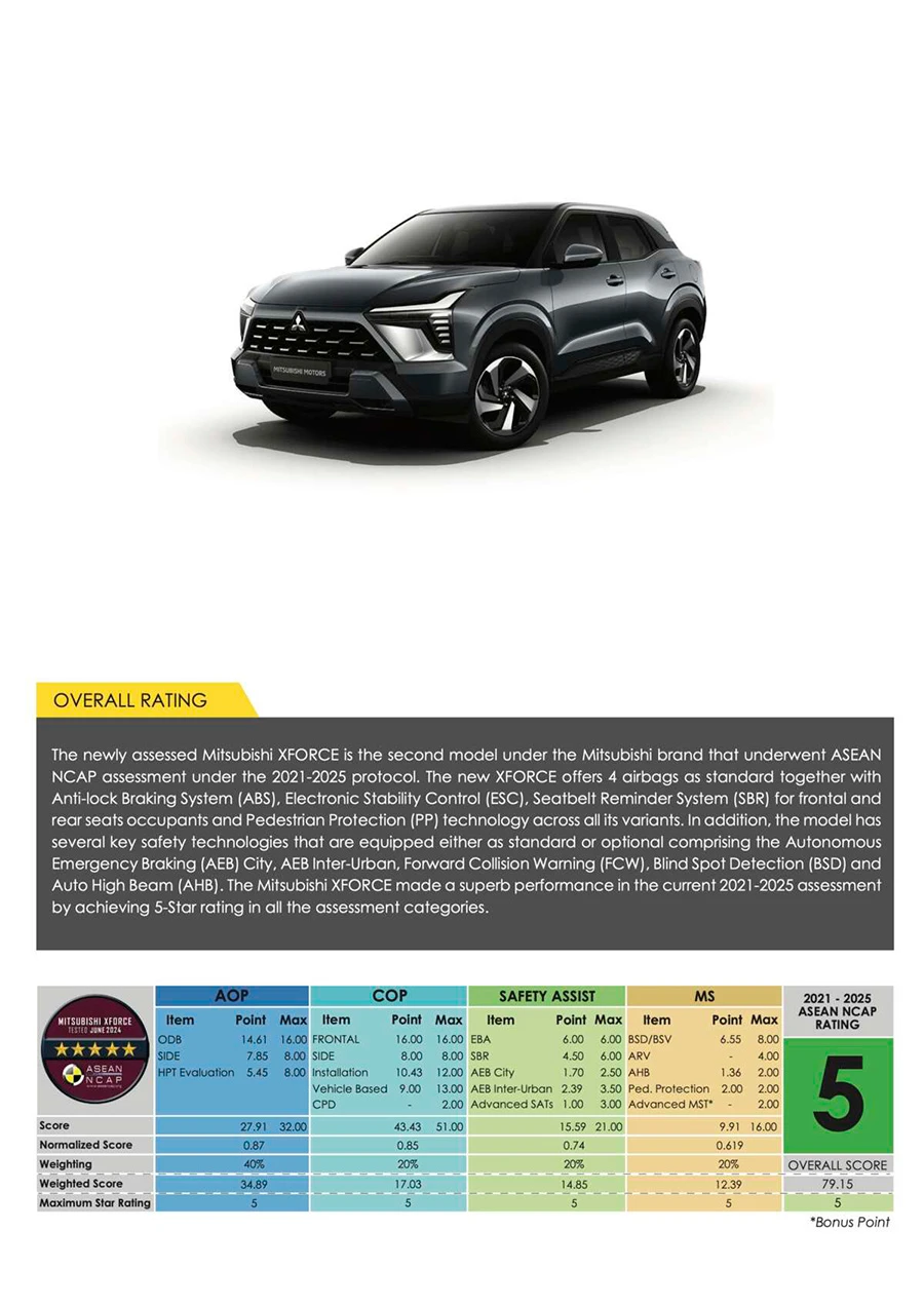 Mitsubishi XForce เอสยูวีขนาด B-Segment จากค่ายตราเพชร ได้รับคะแนนระดับ 5 ดาวจากการทดสอบของ Asean NCAP สำหรับปี 2021-2025 โดยได้คะแนนรวมที่ 79.15 คะแนน รถคันนี้เป็นรถรุ่นที่สองของมิตซูบิชิที่ได้ทดสอบการชนตามมาตรฐานนี้ รองจาก Triton โฉมล่าสุด