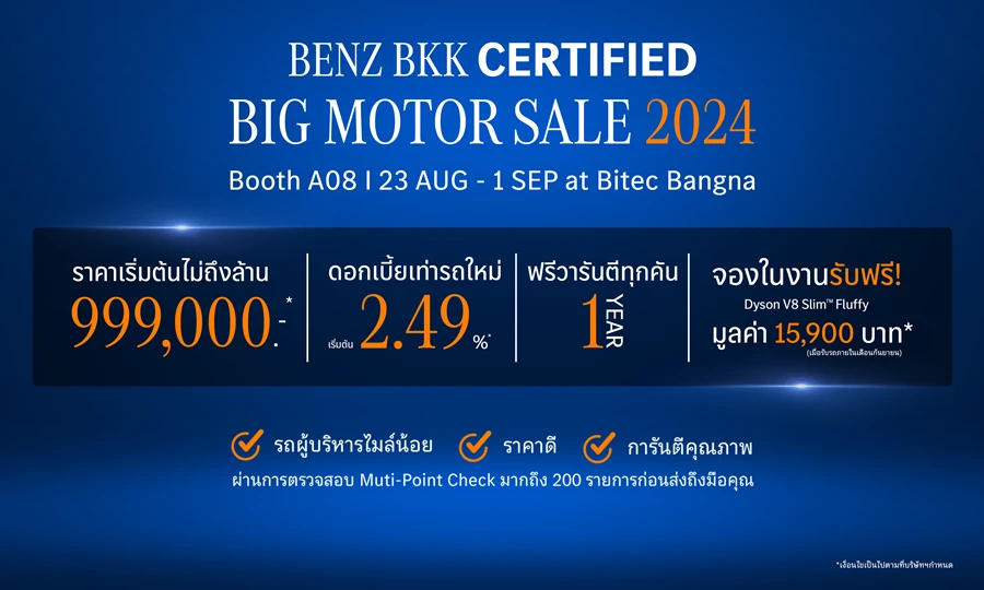 ขณะเดียวกัน รถทุกคันของ BENZ BKK CERTIFIED จะได้รับการรับประกัน หรือ Warranty สูงสุดฟรี 1 ปี และหากจองรถและรับรถภายในวันที่ 30 กันยายน 2567 รับฟรี!!! เครื่องดูดฝุ่น Dyson มูลค่า 15,900 บาท ส่วนลูกค้าที่ตกลงขายรถยนต์เมอร์เซเดส-เบนซ์ คันเดิมกับทาง BENZ BKK CERTIFIED ระหว่างวันนี้ - 31 สิงหาคม 2567 รับฟรี!!! ทองคำมูลค่า 20,000 บาท ทุกคันอีกด้วย