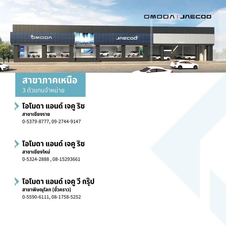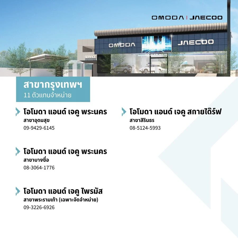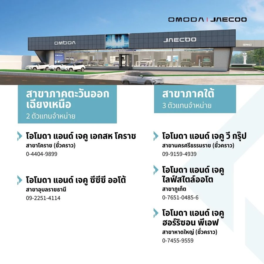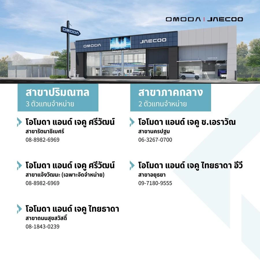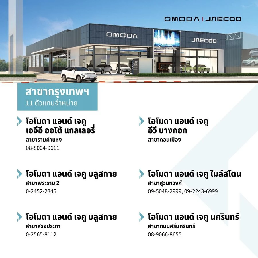 สำหรับผู้สนใจสามารถสัมผัสประสบการณ์การขับขี่ OMODA C5 EV และจองรถทั้ง 2 รุ่นได้แล้ววันนี้ ในงาน OJ AUTO EXPO ที่เซ็นทรัลลาดพร้าว ชั้น G โซน B ในวันที่ 22 – 28 สิงหาคมนี้ หรือสัมผัสประสบการณ์กับผู้จำหน่ายทั่วประเทศของ OMODA & JAECOO ทั้ง 23 แห่ง ครอบคลุมทุกภูมิภาค ทั่วประเทศไทย รายชื่อดังนี้