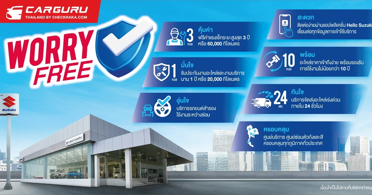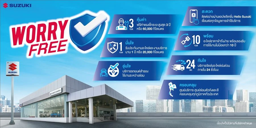อีกทั้ง ลูกค้ารถยนต์ซูซูกิยังมั่นใจได้ว่า เราจะมอบการดูแลและบริการด้วยคุณภาพและมาตรฐานที่ดีแก่ทุกท่าน ภายใต้แคมเปญ SUZUKI WORRY FREE ที่เริ่มมีผลบังคับใช้ตั้งแต่วันที่ 1 สิงหาคม 2567 ที่ผ่านมา โดยประกอบไปด้วยรายละเอียดการดูแลรถยนต์ของลูกค้า ทั้ง 7 หัวข้อดังนี้